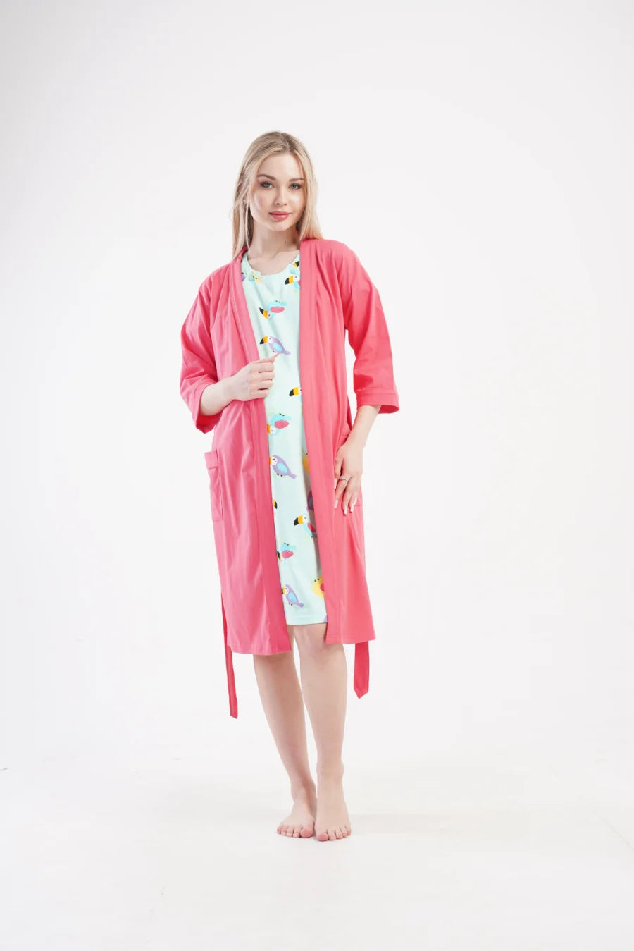 Zestaw do spania składający się z koszuli nocnej i szlafroka to idealne połączenie komfortu i kobiecego stylu. Koszula nocna ma krótki rękaw i okrągły dekolt, a jej przód zdobi kolorowy nadruk z motywem tukana, który dodaje całości uroku. Delikatny, jasnozielony kolor wprowadza w spokojny, relaksujący nastrój.