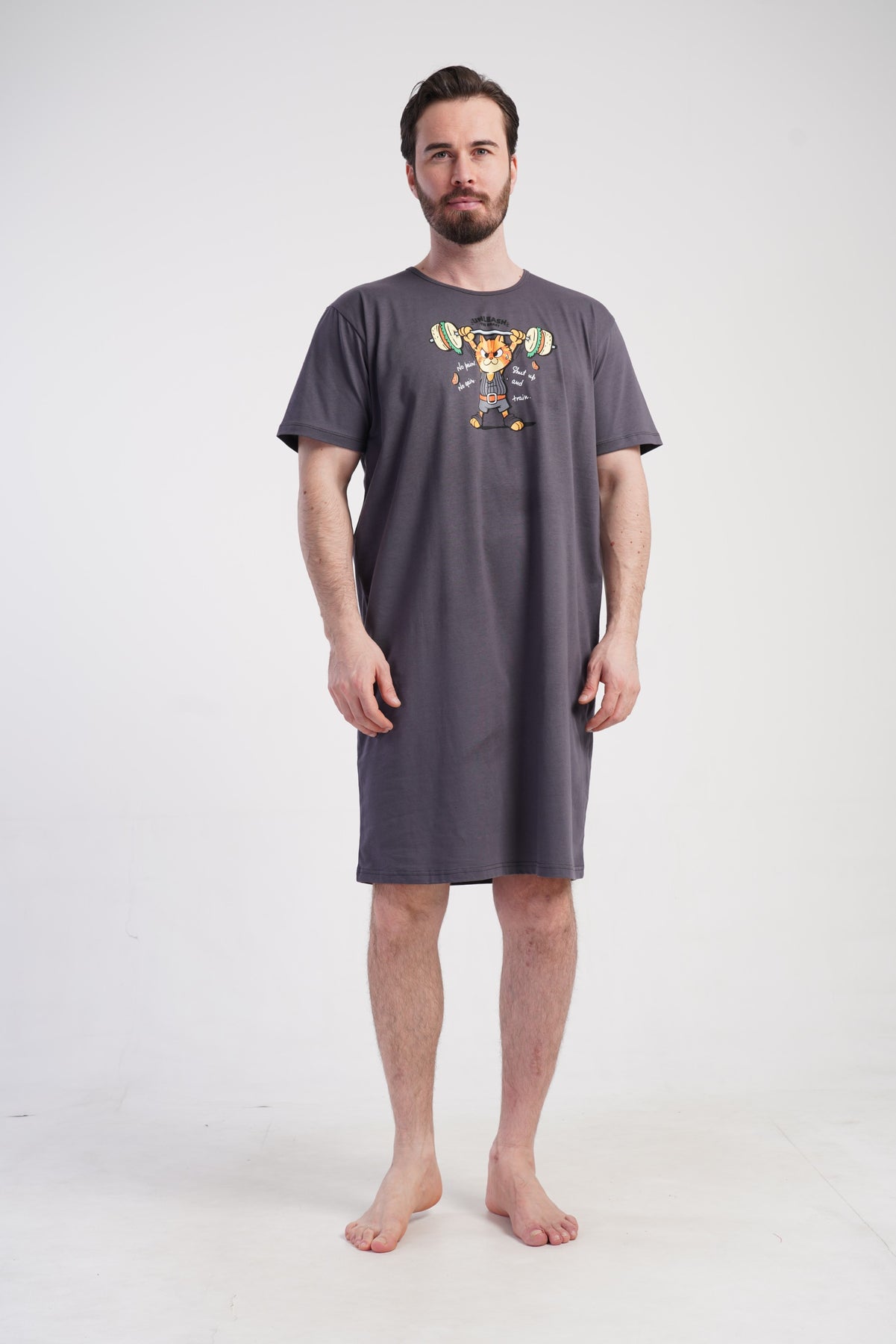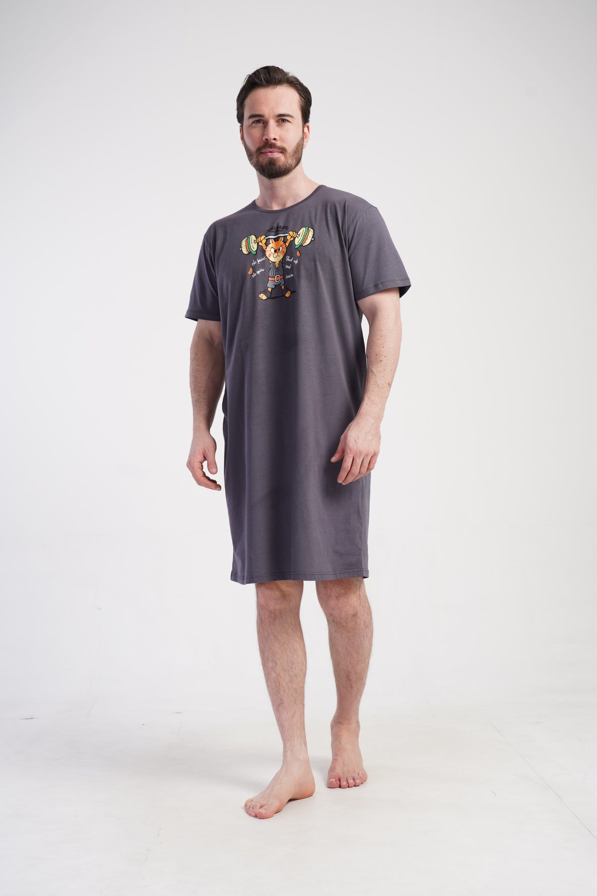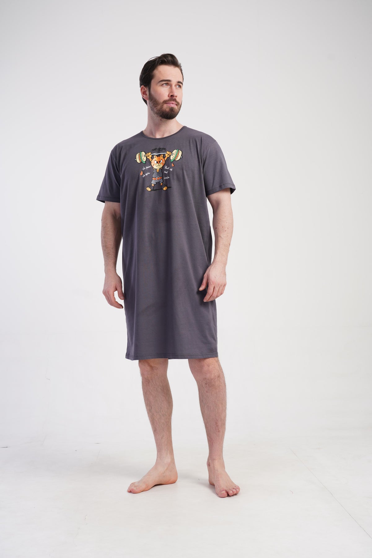 Model wykonany jest z tkaniny w modnym, ciemnoszarym odcieniu, ozdobionej zabawnym nadrukiem tygrysa podnoszącego hantle – oryginalny akcent dodaje koszuli charakteru i humoru. Krótki rękaw czyni ją praktycznym wyborem na lato, ale dzięki naturalnej tkaninie będzie również wygodna w chłodniejsze noce.