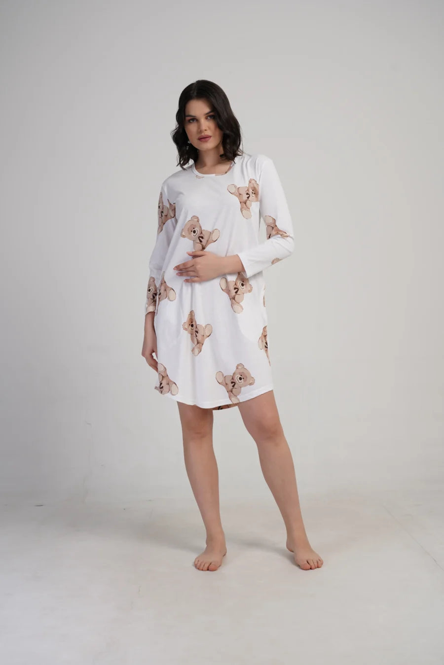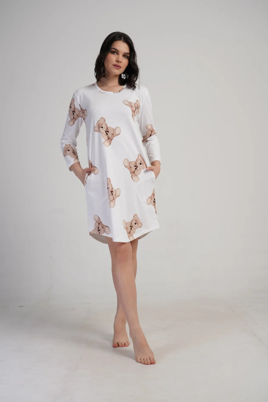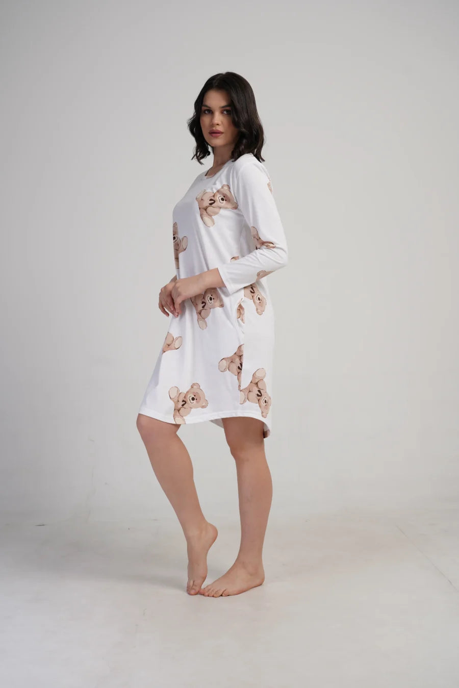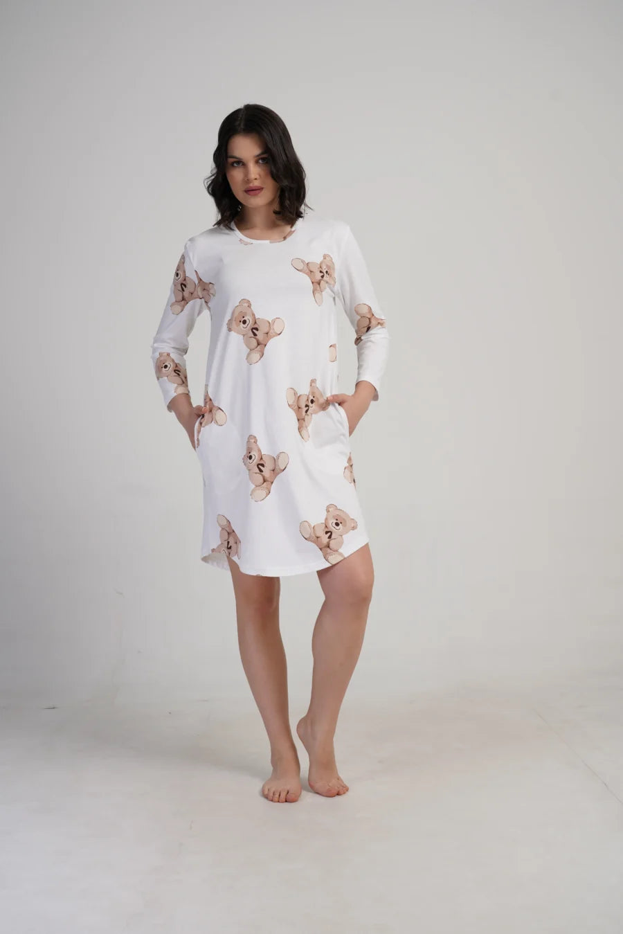Zadbaj o wygodę i przytulność każdej nocy dzięki uroczej koszuli nocnej z nadrukiem pluszowych misiów. Model wyróżnia się prostym, swobodnym krojem z długim rękawem, który zapewnia pełen komfort niezależnie od pory roku.