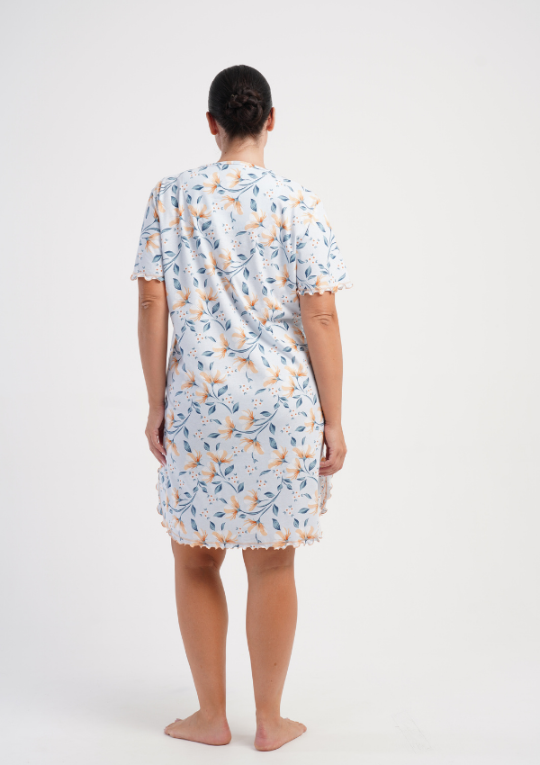 Koszula ma krótki rękaw zakończony delikatną falbanką oraz dekolt półokrągły z krótką listwą guzikową, co dodaje jej subtelnego, dziewczęcego uroku. Całość zdobi delikatny, kwiatowy wzór w odcieniach żółci i zieleni, pięknie prezentujący się na błękitnym tle. Dół zakończony jest falowanym brzegiem, który podkreśla lekkość i zwiewność fasonu.