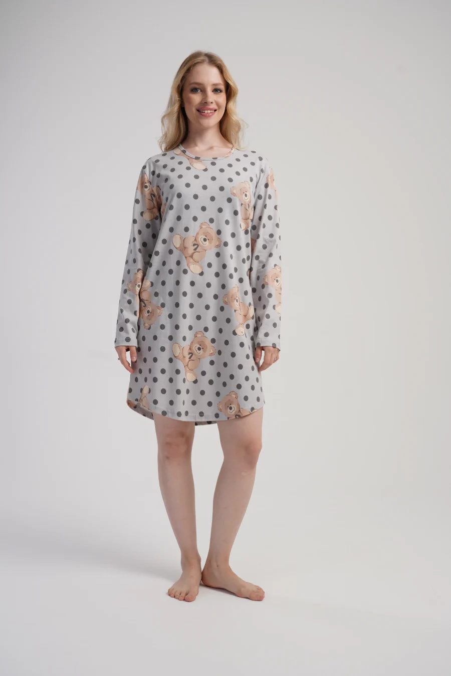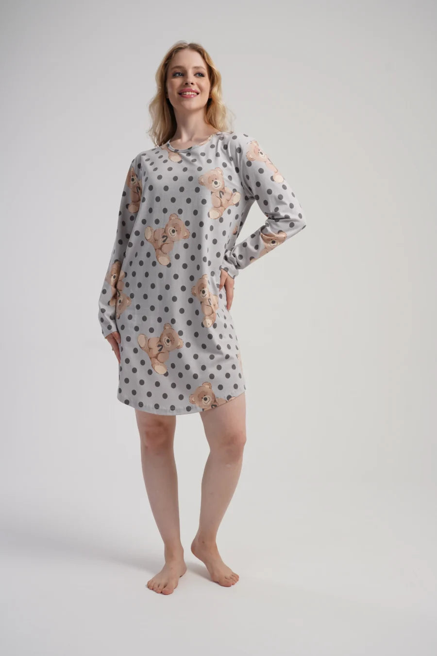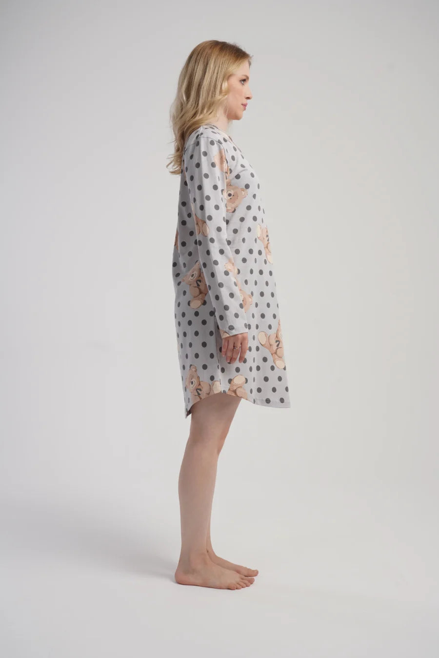 Koszula ma prost y krój z długim rękawem, dzięki czemu świetnie chroni w chłodniejsze noce, jednocześnie zapewniając swobodę ruchów. Szary materiał w ciemnoszare grochy ozdobiony nadrukiem uroczych misiów nadaje całości dziewczęcego uroku.