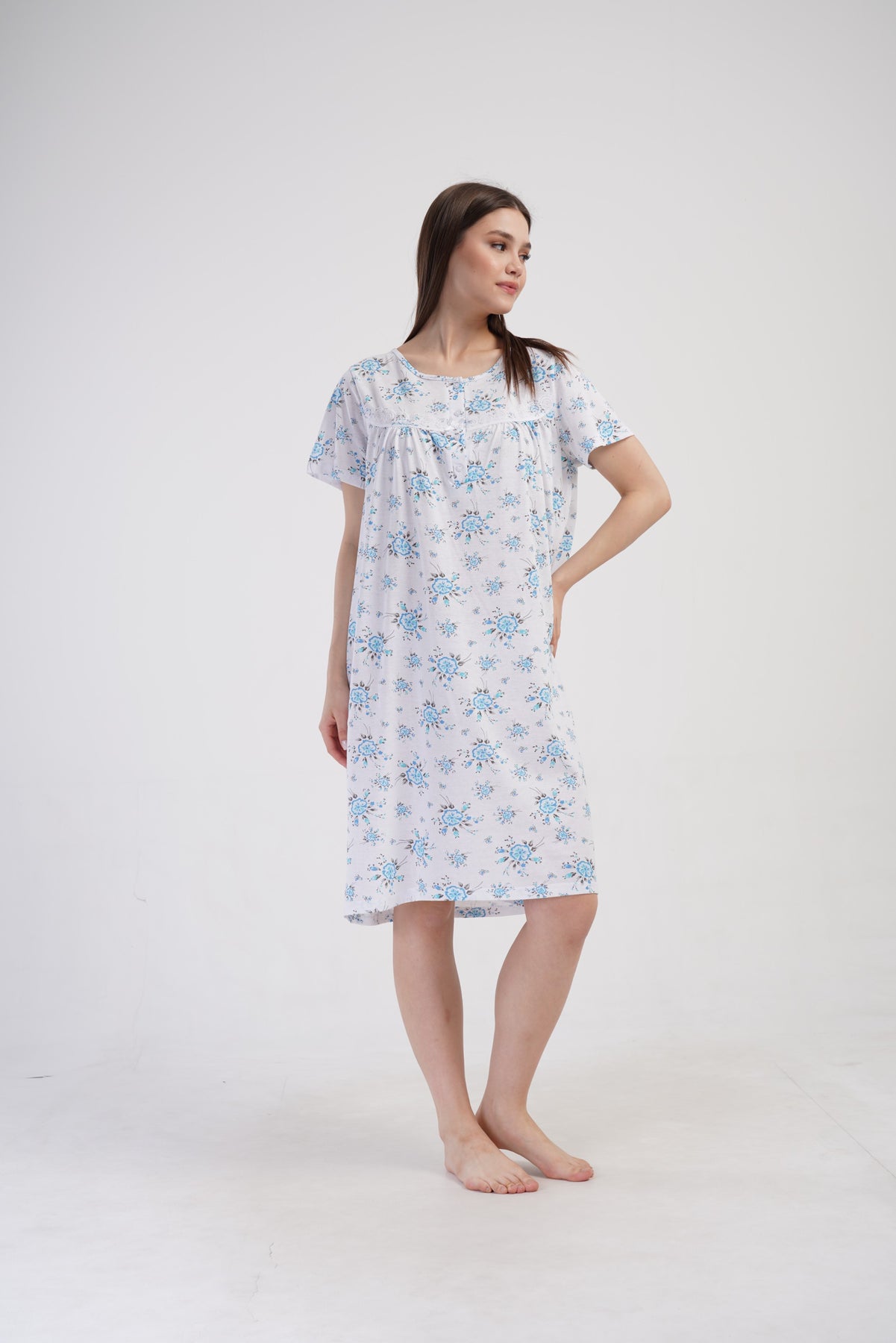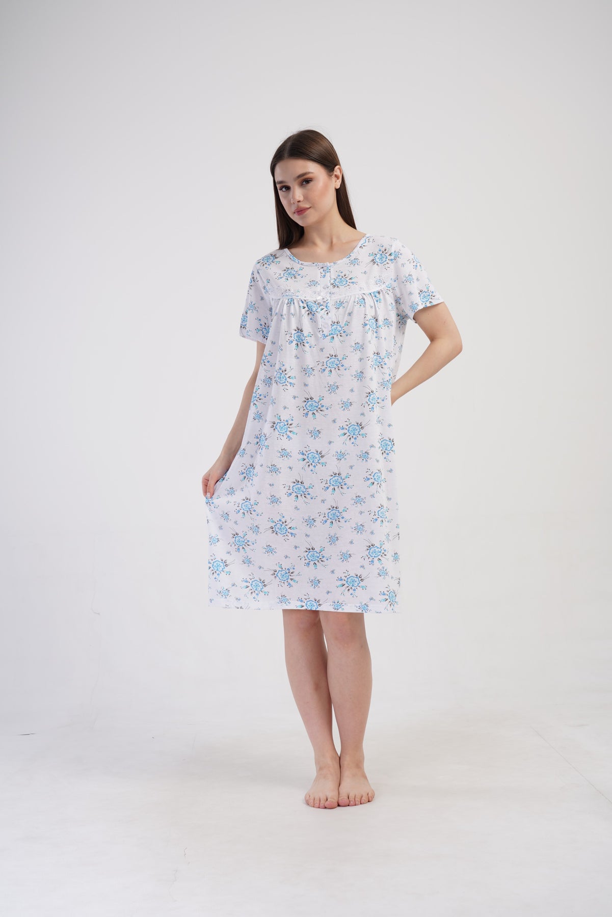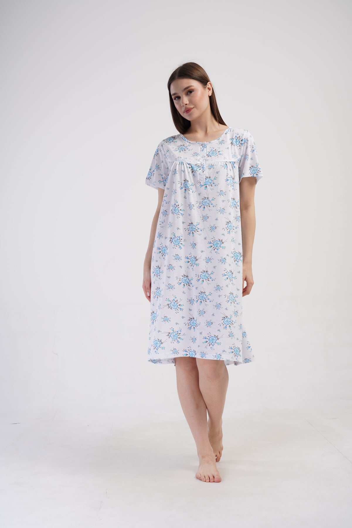 Wzór w delikatne, błękitne kwiaty na białym tle sprawia, że model jest lekki i świeży wizualnie – idealny na cieplejsze noce. Oddychająca bawełna gwarantuje przyjemność noszenia, a uniwersalny design sprawdzi się zarówno w domu, jak i podczas wypoczynku poza nim.