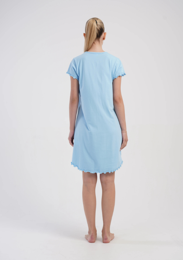Model o luźnym, wygodnym kroju doskonale dopasowuje się do sylwetki, nie krępując ruchów. Okrągły dekolt nadaje jej delikatności, a falbanki przy rękawach i dole koszuli dodają romantycznego charakteru. Całość w jednolitym niebieskim kolorze – idealny wybór dla kobiet, które cenią subtelny, klasyczny styl.