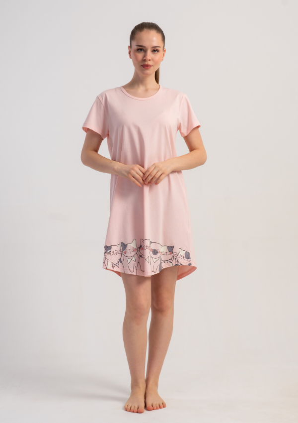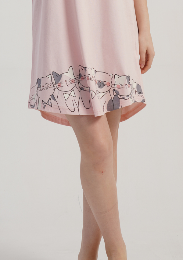 Model wyróżnia się jasnoróżowym kolorem oraz uroczym nadrukiem kotków, który nadaje całości lekkiego i dziewczęcego charakteru. Delikatnie zaokrąglony dół podkreśla komfortowy fason.
