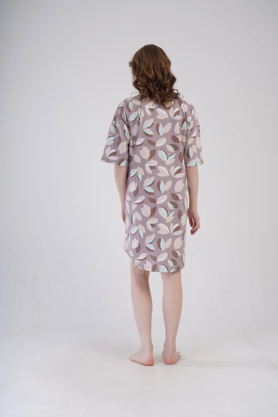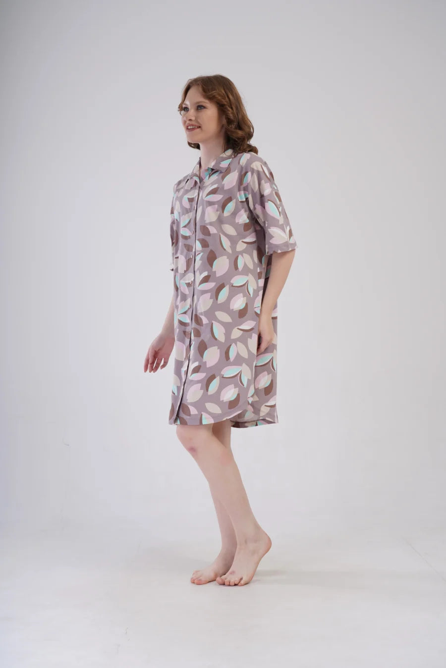Subtelny nadruk pastelowych liści na tle w odcieniu przygaszonego fioletu sprawia, że koszula łączy w sobie styl, lekkość i kobiecy wdzięk.