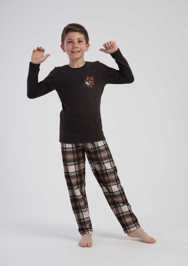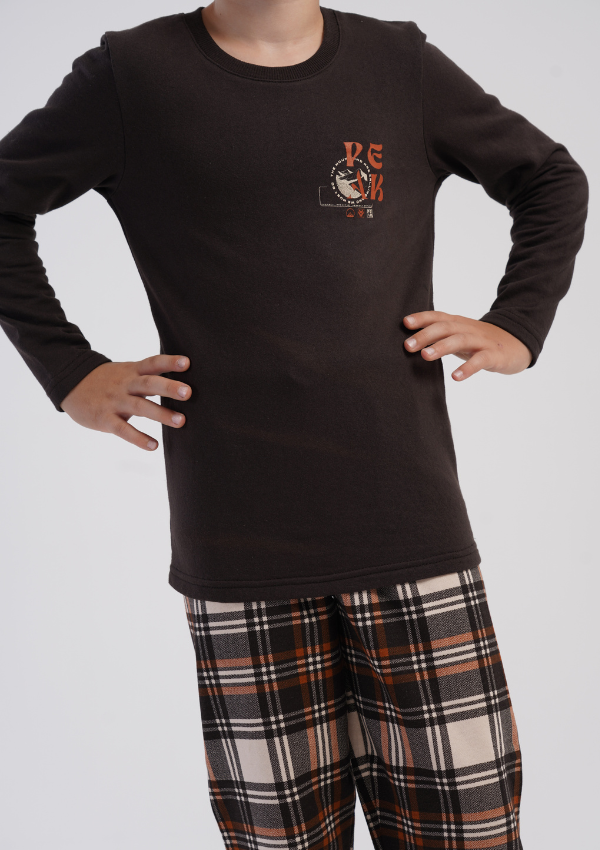 Dwuczęściowa, ocieplana piżama chłopięca wykonana z miękkiej, wysokogatunkowej bawełny, która zapewnia przyjemne ciepło i pełen komfort noszenia podczas chłodniejszych wieczorów i zimowych nocy. Bluzka w ciemnobrązowym kolorze została ozdobiona subtelnym nadrukiem na piersi, który dodaje jej nowoczesnego, chłopięcego charakteru.