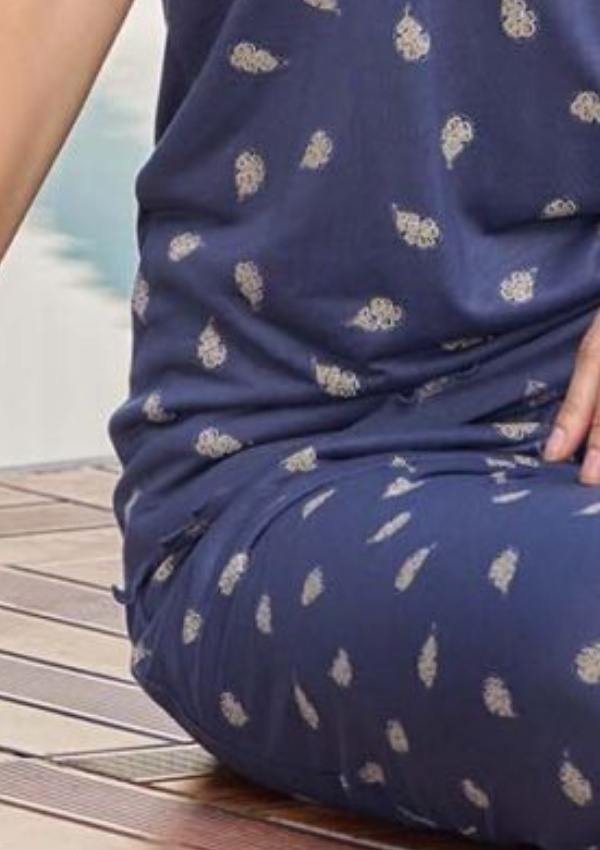Góra z krótkim rękawem, dekoltem w kształcie litery V i ozdobnymi guziczkami dodaje uroku, a falowane wykończenia rękawków wprowadzają subtelny, kobiecy akcent. Długie spodnie w prostym kroju z elastycznym pasem zapewniają pełną swobodę ruchu. Ciemnoniebieski materiał z drobnym, złocistym wzorem podkreśla delikatny charakter zestawu.