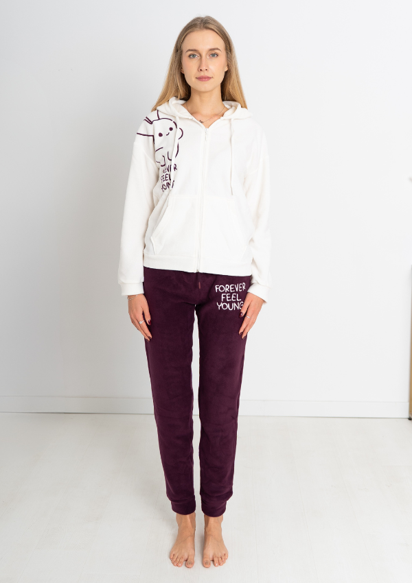 Spodnie w kolorze bordowym posiadają elastyczną talię, ściągacze u dołu nogawek oraz dopasowany biały nadruk, który tworzy spójną całość z bluzą.