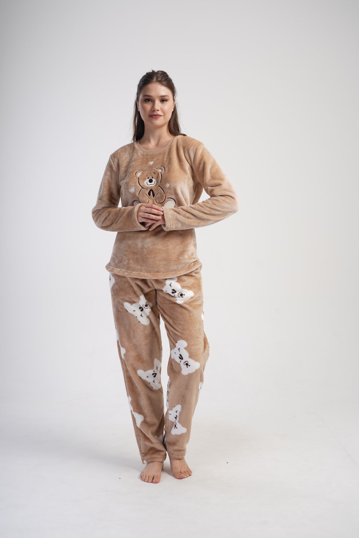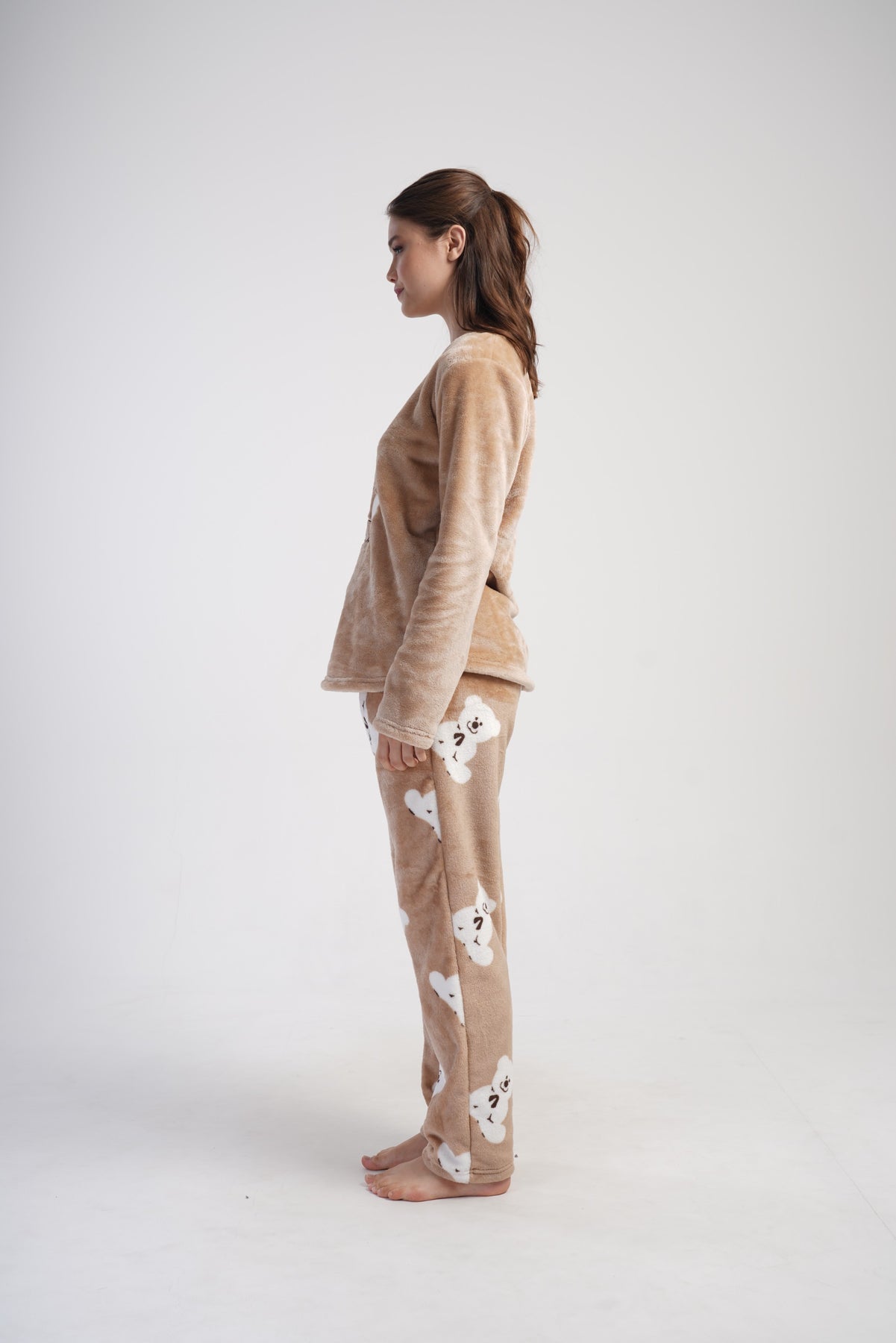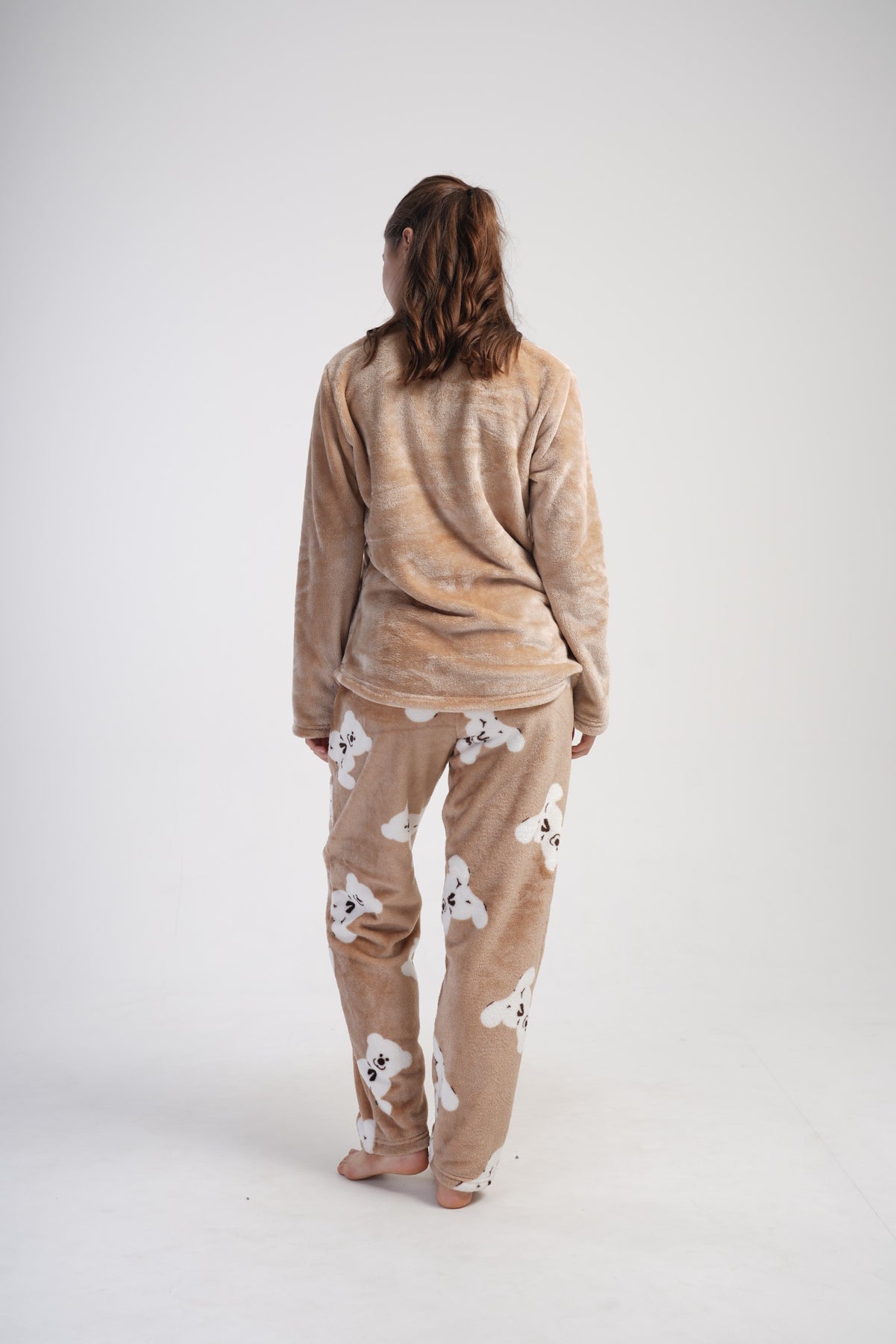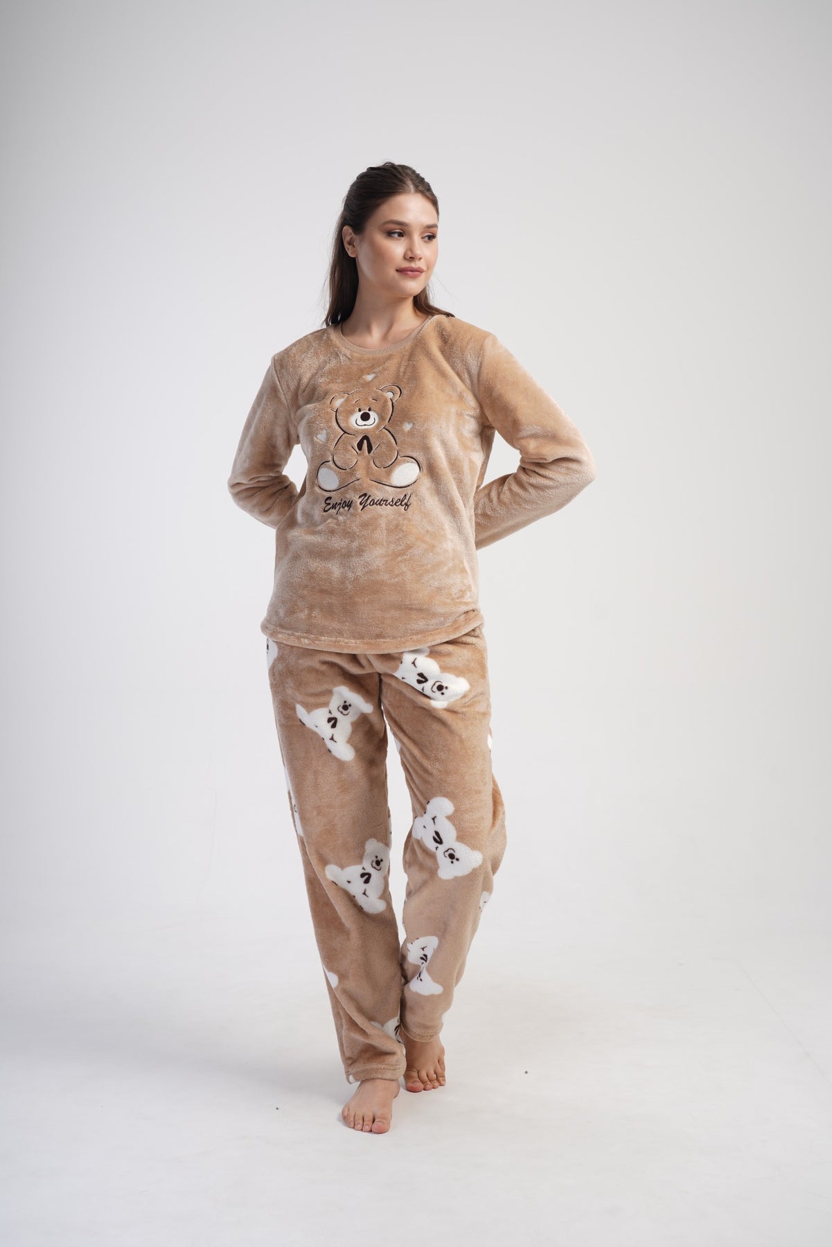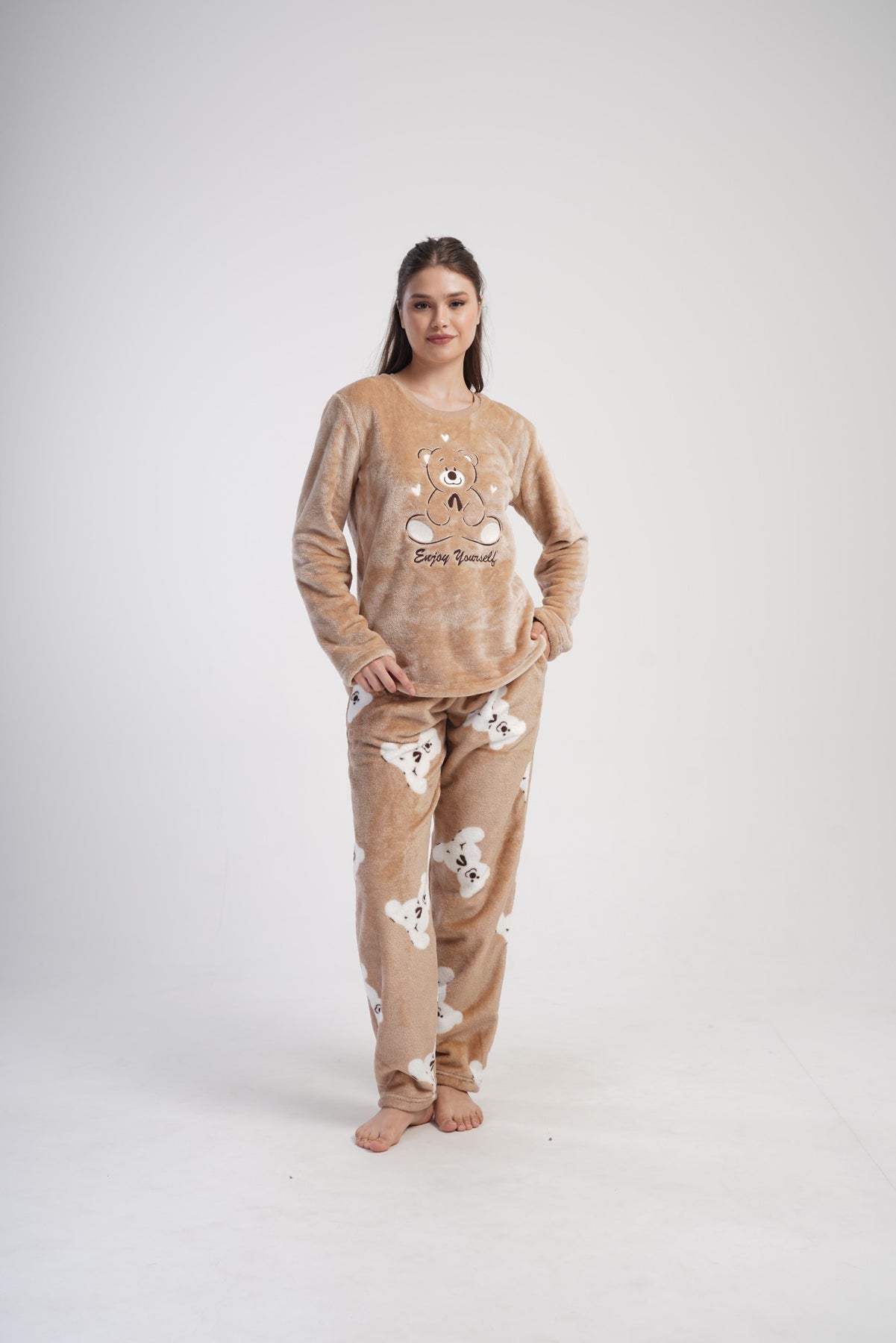 Bluzka w karmelowym kolorze ozdobiona została uroczym nadrukiem misia i napisem „Enjoy Yourself”, który wprowadza pozytywny nastrój. Spodnie w tym samym odcieniu, z powtarzalnym motywem białych misiów, tworzą spójny, słodki zestaw.