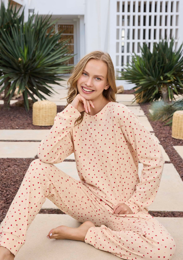 Całość została ozdobiona uroczym nadrukiem w czerwone serduszka, który dodaje piżamie dziewczęcego uroku i subtelnej elegancji. Miękka i elastyczna tkanina sprawia, że komplet doskonale nadaje się zarówno do snu, jak i domowego relaksu.