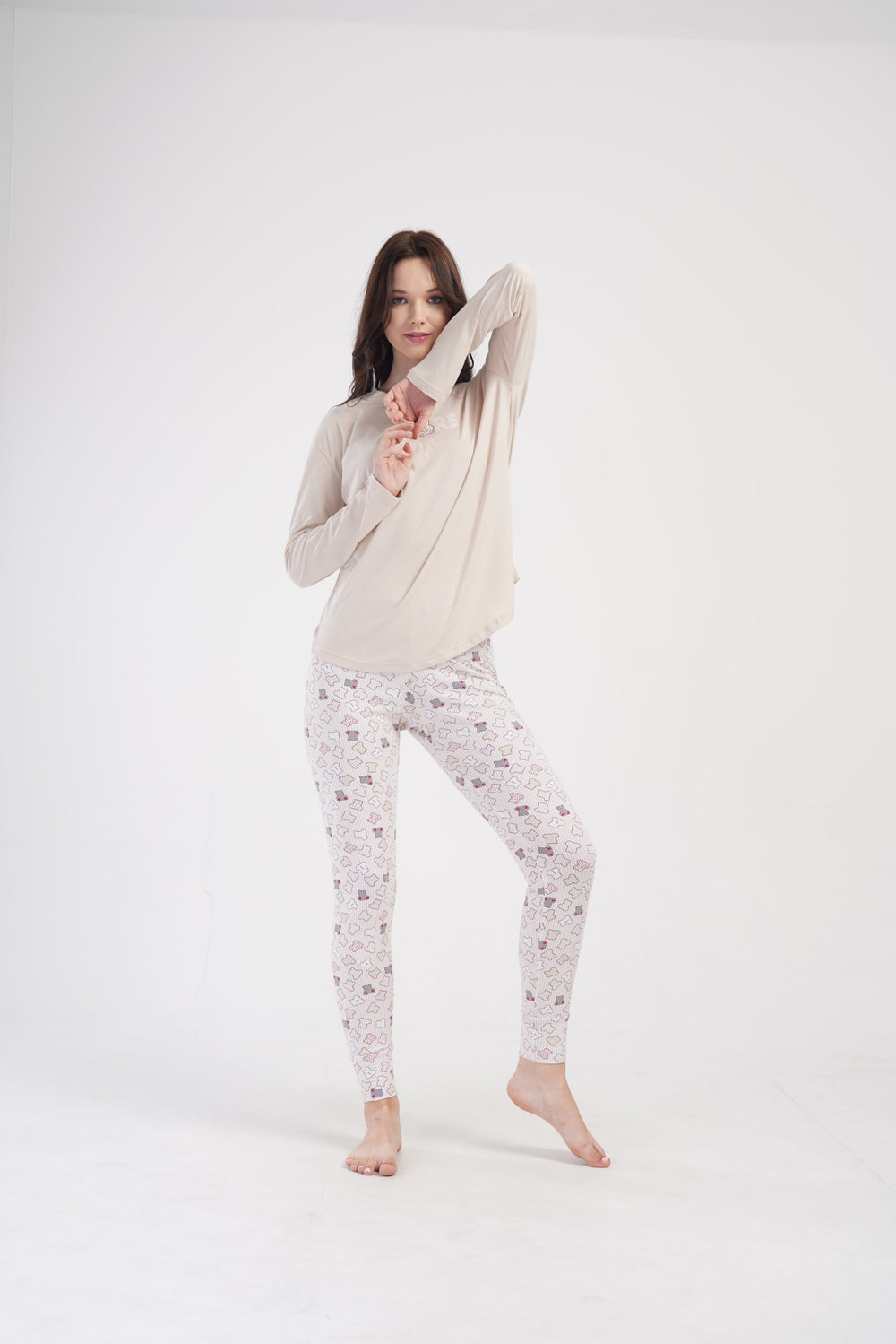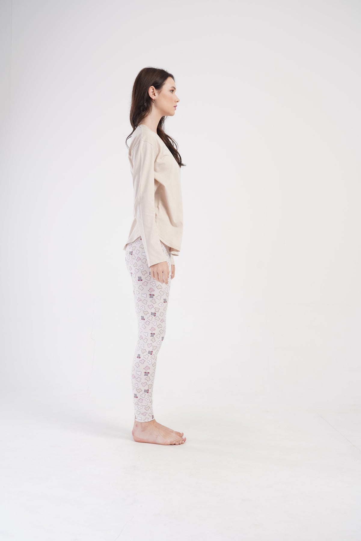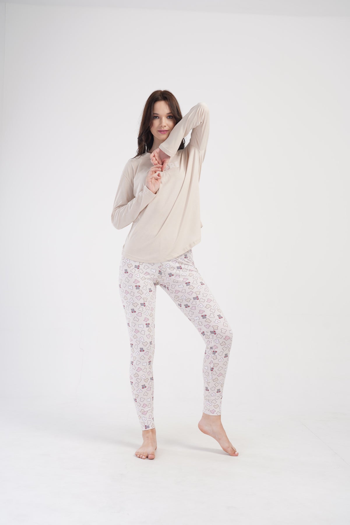 Bluzka w intensywnym beżowym kolorze została ozdobiona uroczym napisem „AMORE” z motywem serduszka, co nadaje całości romantycznego charakteru. Legginsy w jasnym kolorze z subtelnym wzorem tworzą harmonijny i stylowy komplet.
