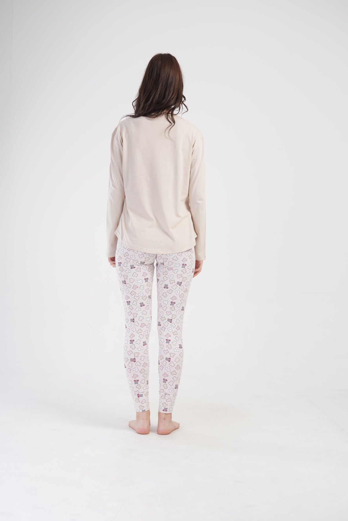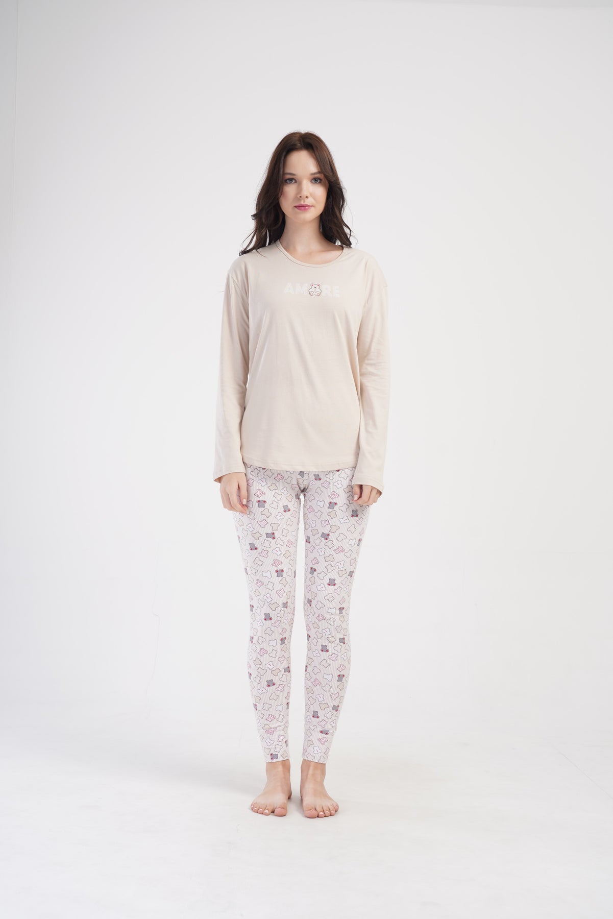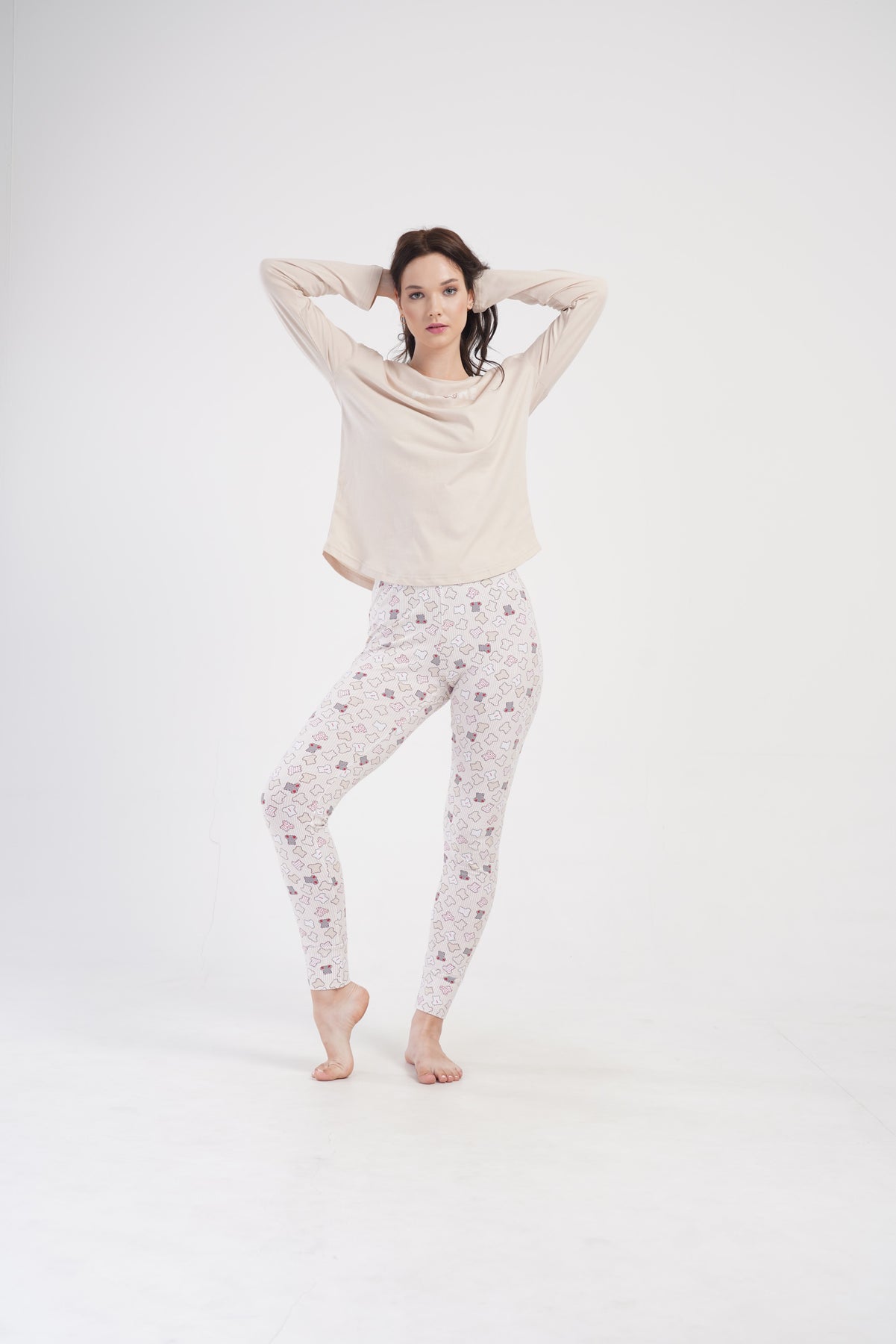 Bluzka w intensywnym beżowym kolorze została ozdobiona uroczym napisem „AMORE” z motywem serduszka, co nadaje całości romantycznego charakteru. Legginsy w jasnym kolorze z subtelnym wzorem tworzą harmonijny i stylowy komplet.