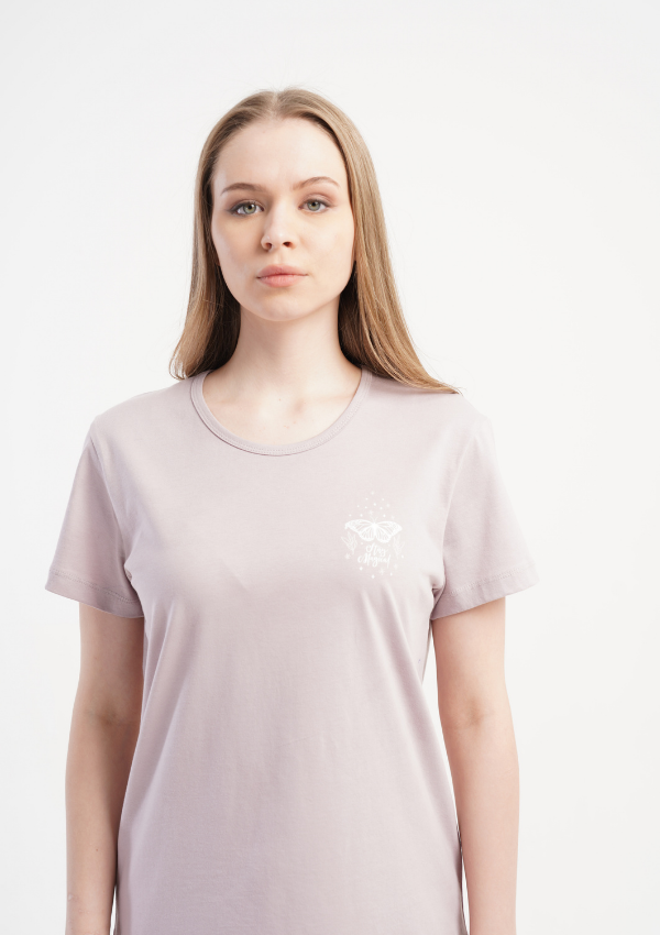 Dwuczęściowa piżama damska w odcieniu pudrowego beżu to komfortowa propozycja na każdą noc. Koszulka z krótkim rękawem i okrągłym dekoltem została ozdobiona subtelnym nadrukiem, który nadaje całości delikatnego charakteru.