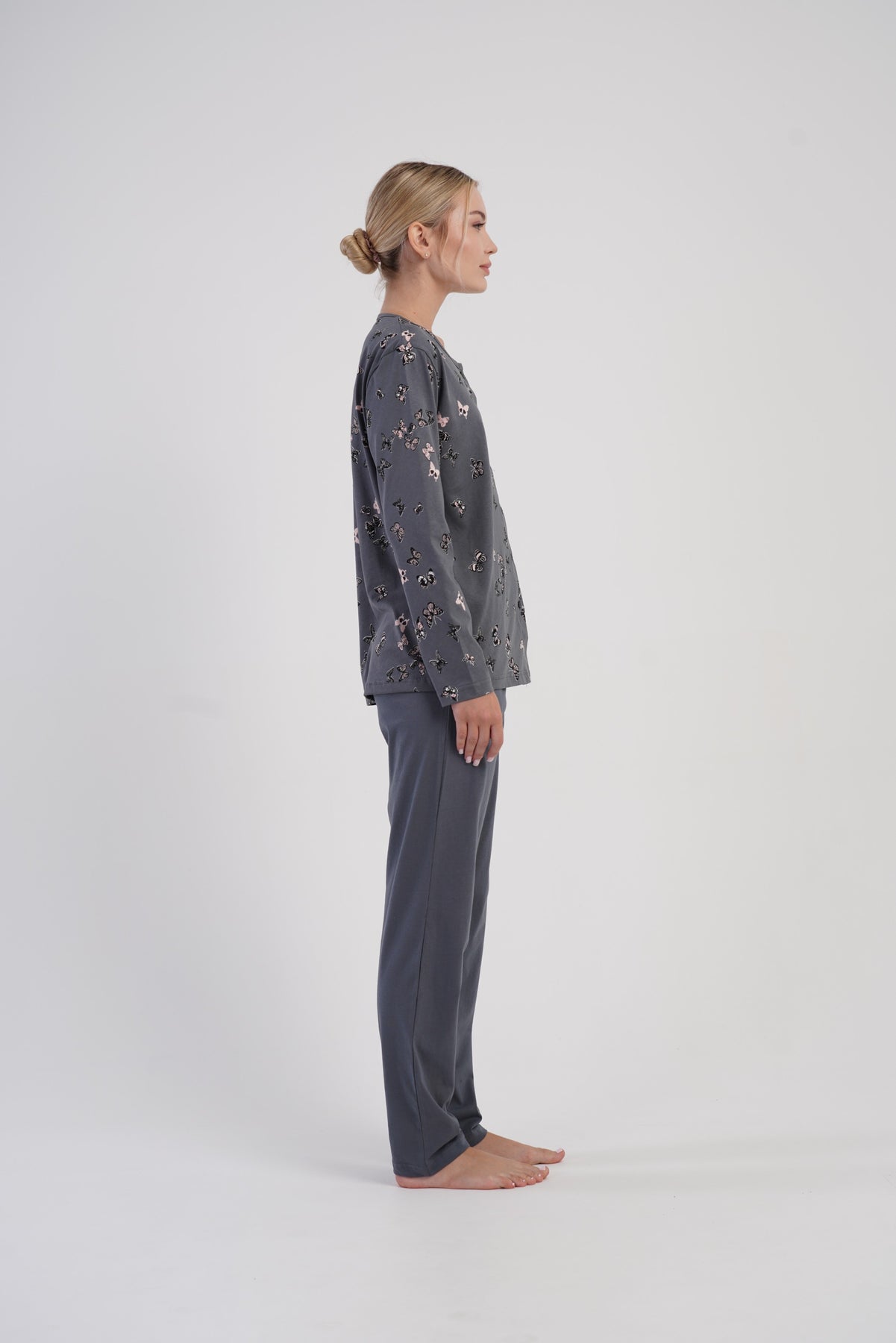 Stylowa i wygodna piżama damska z długim rękawem to doskonały wybór na każdą porę roku. Bluzka w kolorze grafitowym ozdobiona jest subtelnym nadrukiem kokardek w odcieniach różu i beżu, co dodaje całości delikatnego, dziewczęcego charakteru.