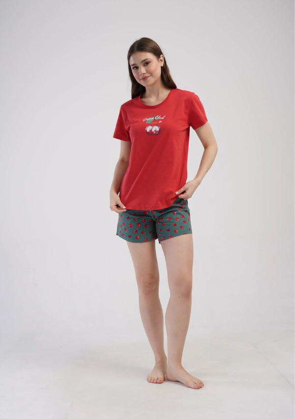 Dwuczęściowa piżama damska z koszulką i szortami to lekka propozycja na cieplejsze noce. Koszulka z krótkim rękawem i okrągłym dekoltem została ozdobiona nadrukiem „Disco Club” z motywem wiśni, który nadaje całości letniego charakteru.