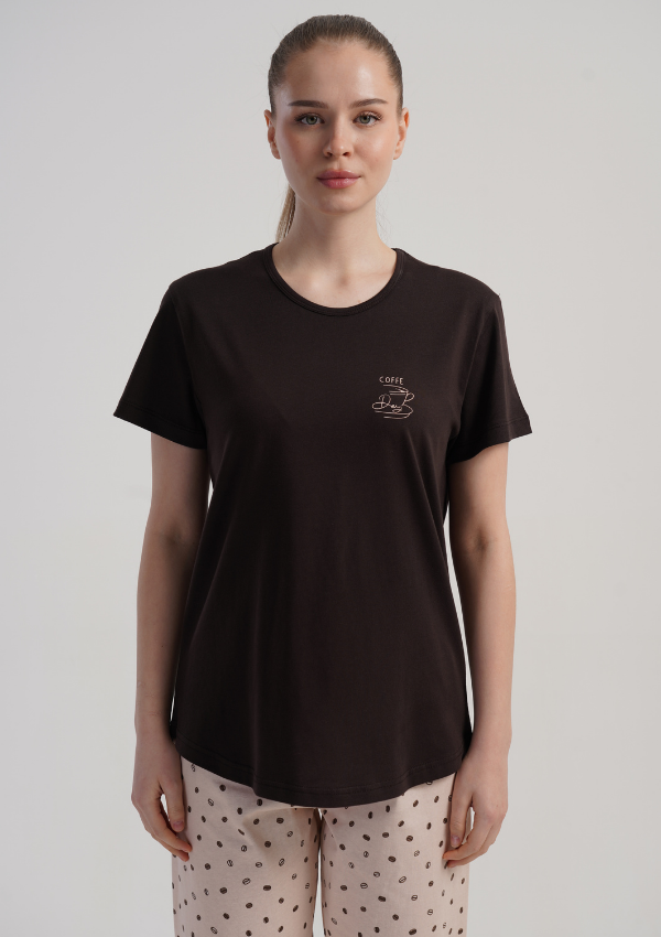 Model wyróżnia się ciepłym, brązowym kolorem oraz subtelnym nadrukiem z motywem filiżanki kawy, który nadaje całości przytulnego charakteru. Wzorzyste spodnie podkreślają lekki, domowy styl.