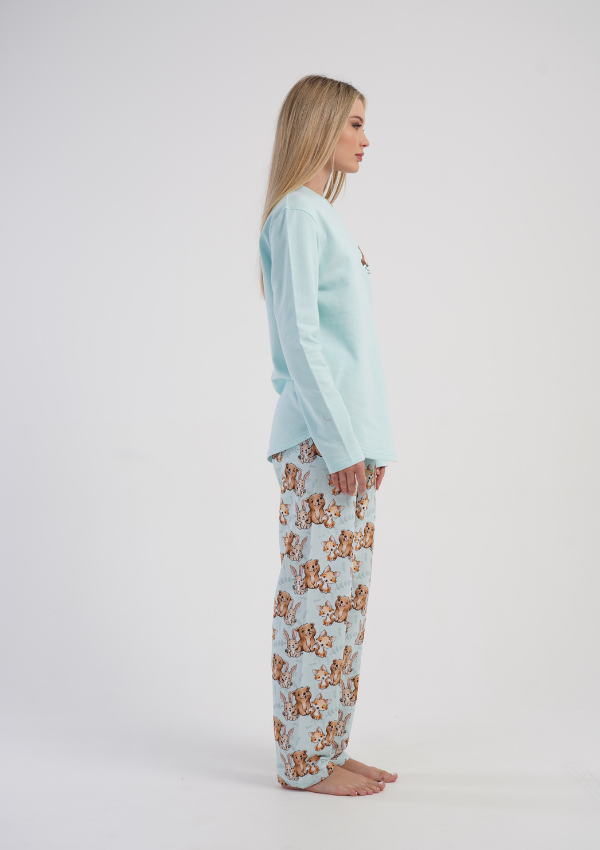 Poznaj wyjątkowo uroczą i komfortową piżamę damską, wykonaną z wysokiej jakości, ocieplanej bawełny, która otuli Cię miękkością o każdej porze roku. Góra piżamy zdobiona jest subtelnym nadrukiem słodkiego pieska, co nadaje całości dziewczęcego, przytulnego charakteru.