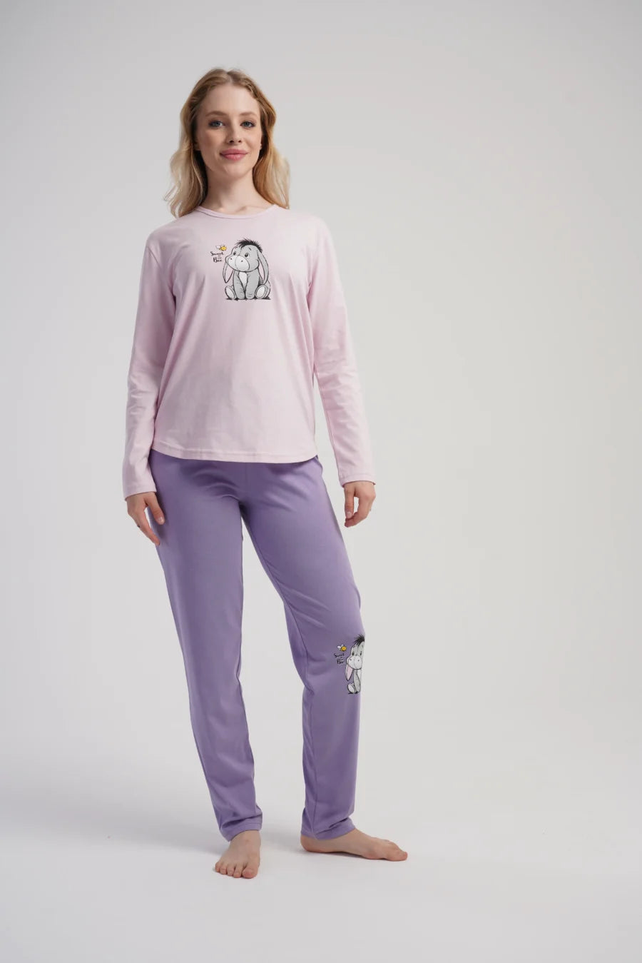 Do kompletu dołączone są lawendowe spodnie z powtarzającym się motywem osiołka na nogawkach. Elastyczna talia oraz prosty krój gwarantują swobodę ruchów i wygodę noszenia.
