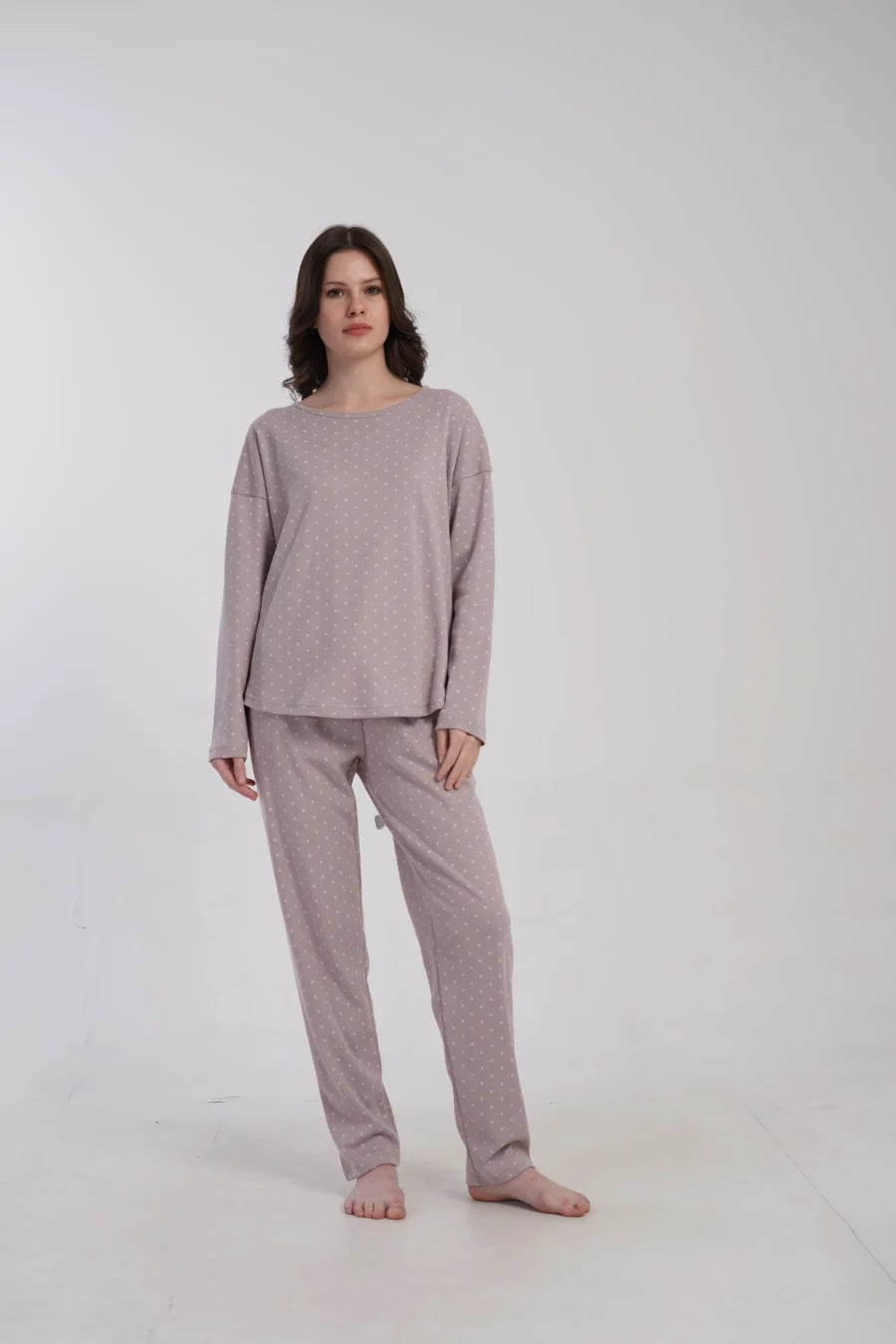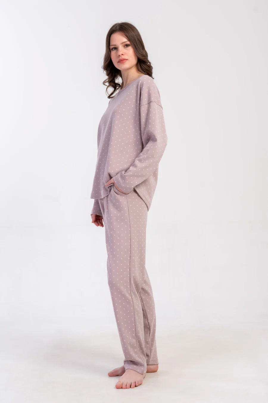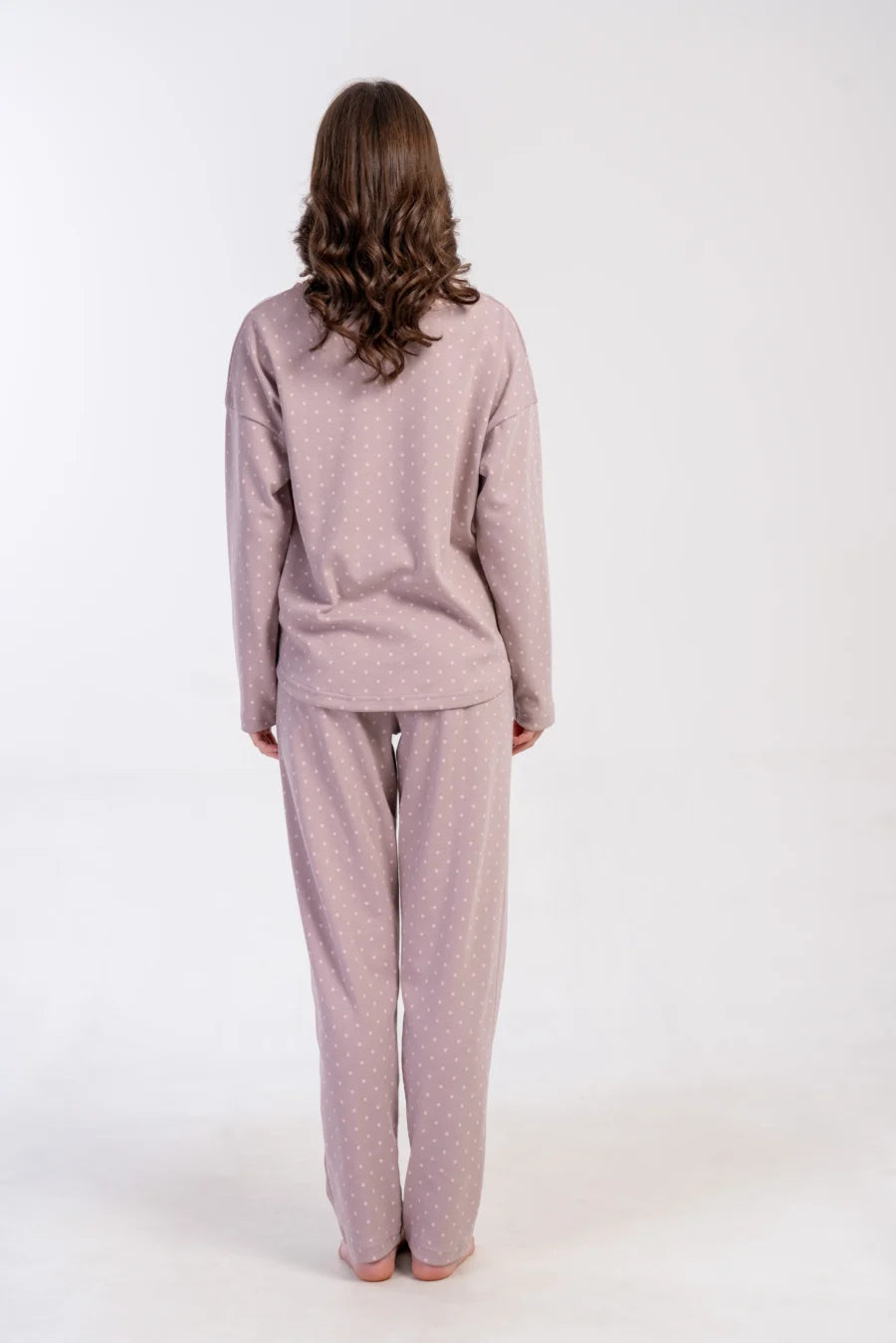 Delikatny nadruk drobnych groszków na przygaszonym wrzosowym tle dodaje subtelności i kobiecego uroku. Luźny, swobodny krój zapewnia wygodę i nie krępuje ruchów – idealna na noc i domowy relaks.