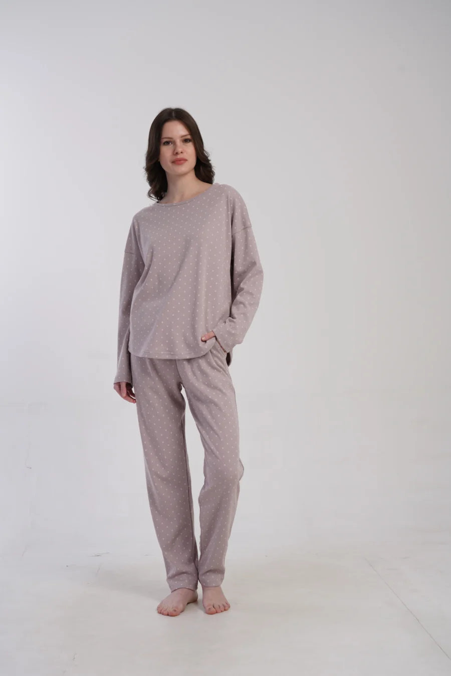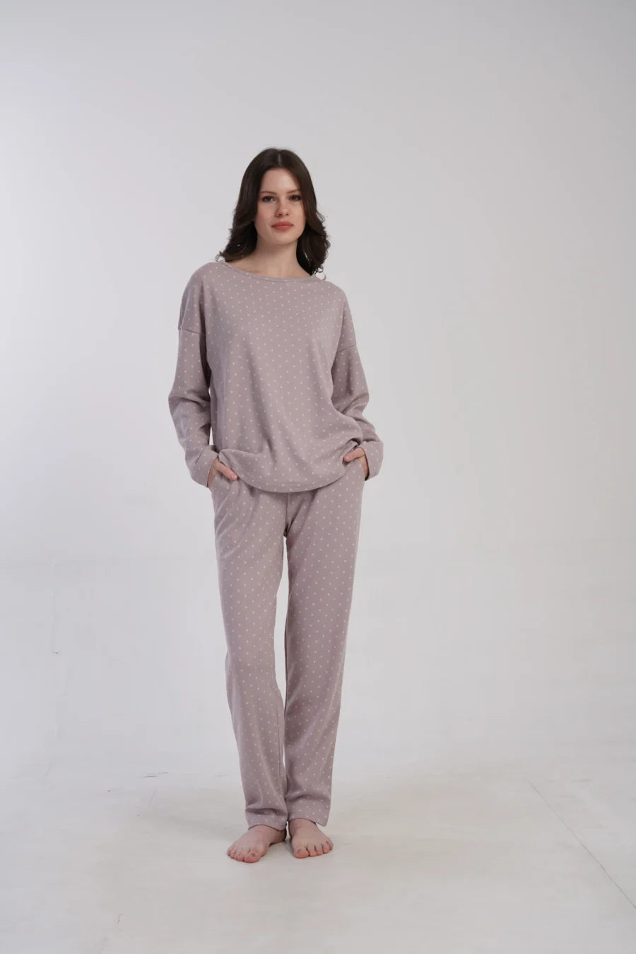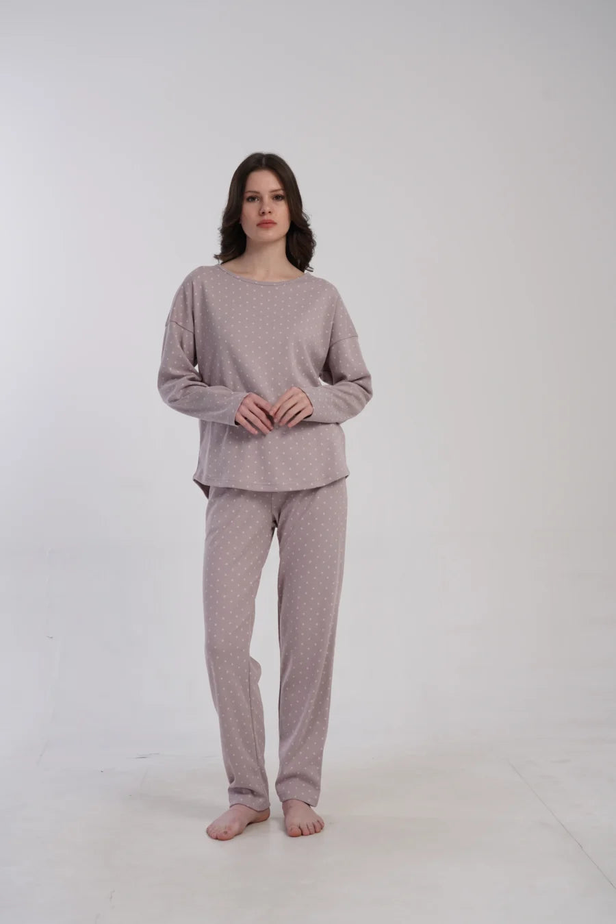 Delikatny nadruk drobnych groszków na przygaszonym wrzosowym tle dodaje subtelności i kobiecego uroku. Luźny, swobodny krój zapewnia wygodę i nie krępuje ruchów – idealna na noc i domowy relaks.