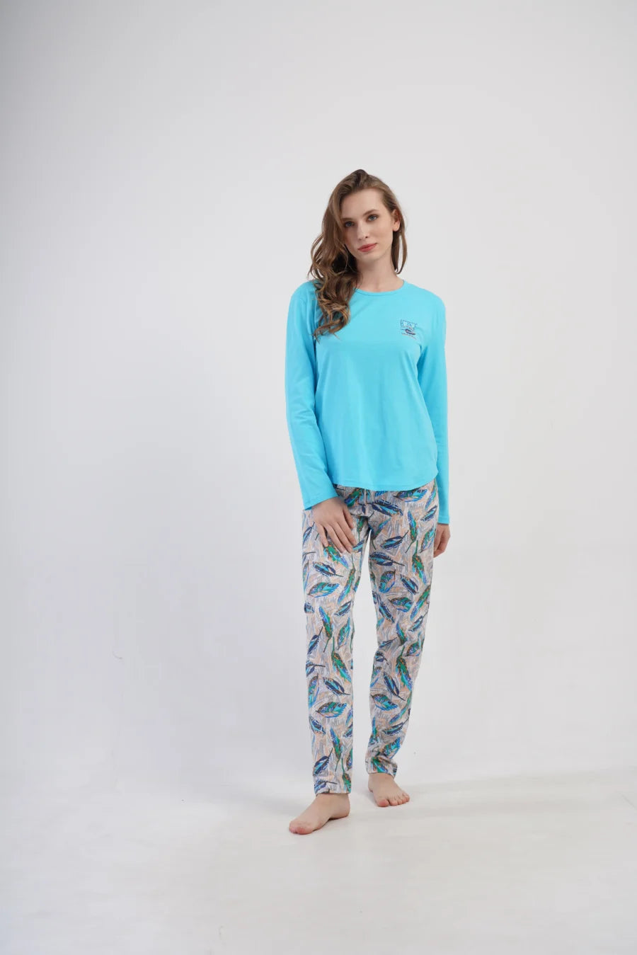 Wygodna i stylowa – ta dwuczęściowa piżama damska łączy subtelny design z komfortem, którego szukasz na co dzień. Górna część, dostępna w dwóch delikatnych kolorach – turkusowym lub brzoskwiniowym – została ozdobiona dyskretnym nadrukiem, który dodaje całości lekkości i kobiecego uroku.