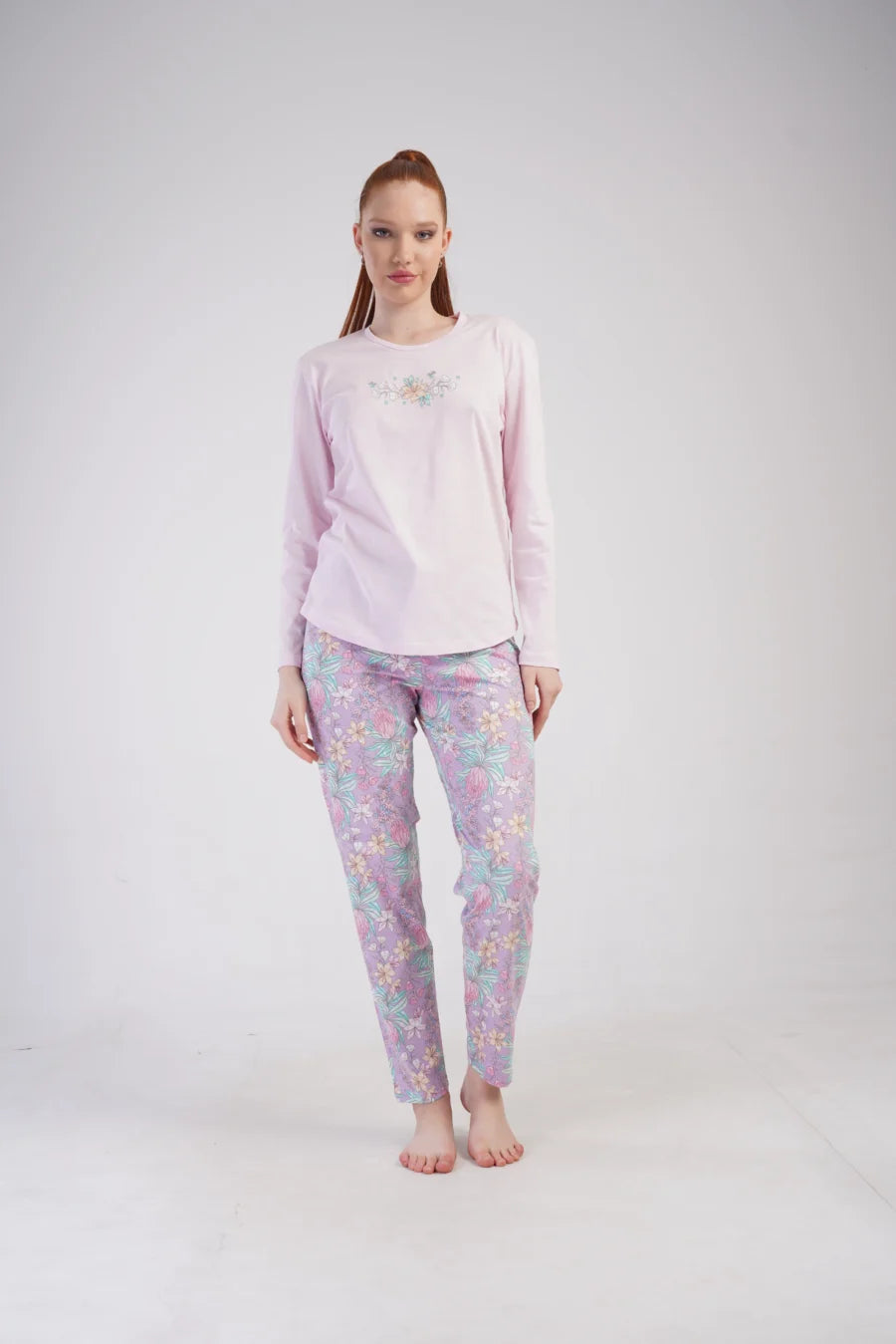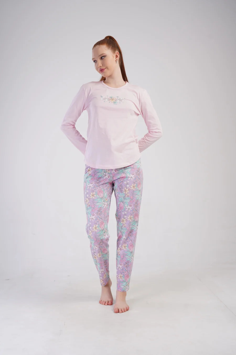 Odkryj subtelny urok i pełnię wygody w tej dwuczęściowej piżamie damskiej wykonanej w 100% z naturalnej bawełny. Delikatna, jasnoróżowa bluzka z długim rękawem ozdobiona została kwiatowym nadrukiem na piersi, który wprowadza romantyczny, kobiecy akcent.