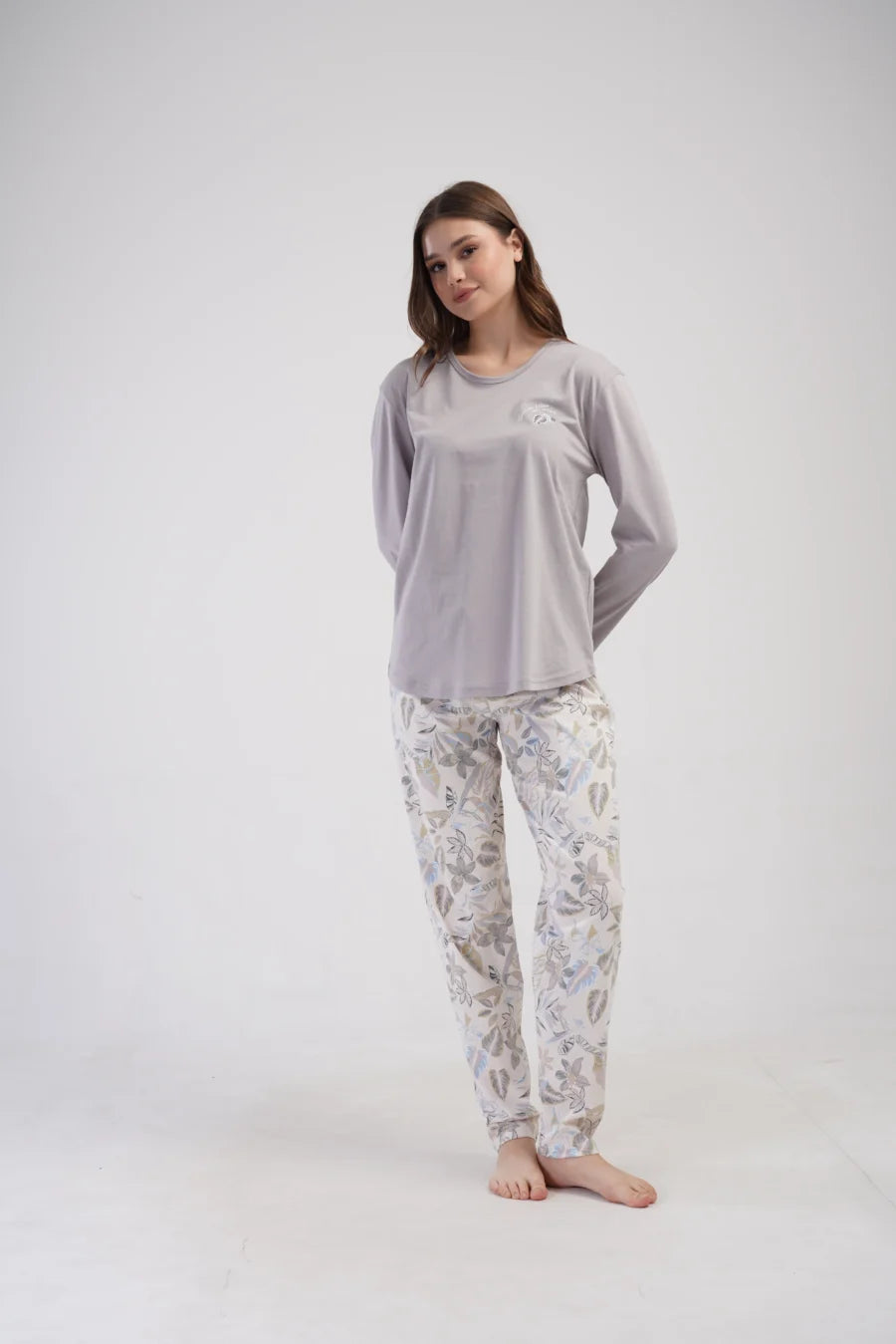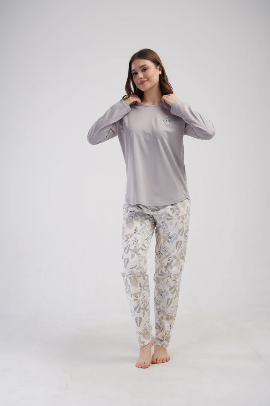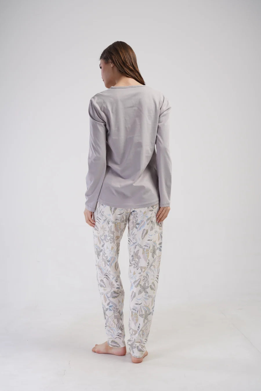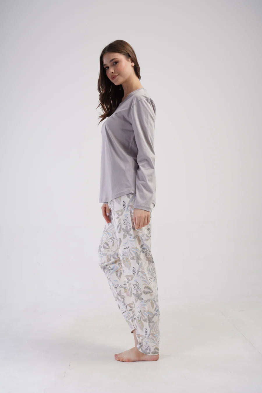 Spodnie z nadrukiem liści w stonowanej kolorystyce harmonijnie uzupełniają górę, tworząc spójny i stylowy zestaw. Naturalna, miękka bawełna zapewnia przewiewność i wygodę podczas snu i codziennego wypoczynku. Model dostępny w dwóch wersjach kolorystycznych – każda subtelna, przyjemna dla oka i niezwykle praktyczna.