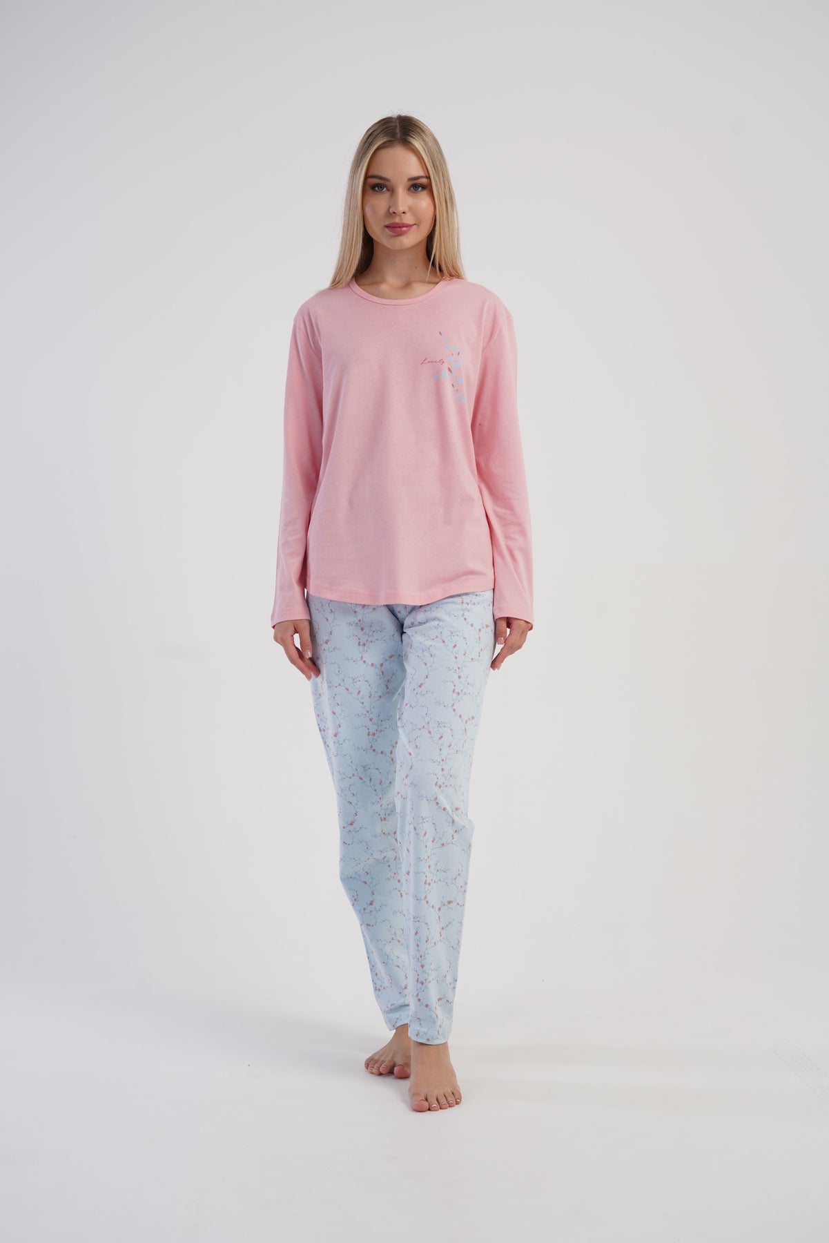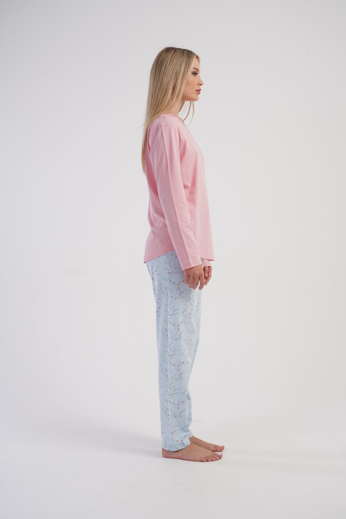 Stylowa i komfortowa piżama damska to doskonały wybór na każdą porę roku. Model składa się z bluzki z długim rękawem w kolorze różowym z delikatnym nadrukiem na piersi oraz prostych spodni w tym samym odcieniu z drobnym, subtelnym wzorem.