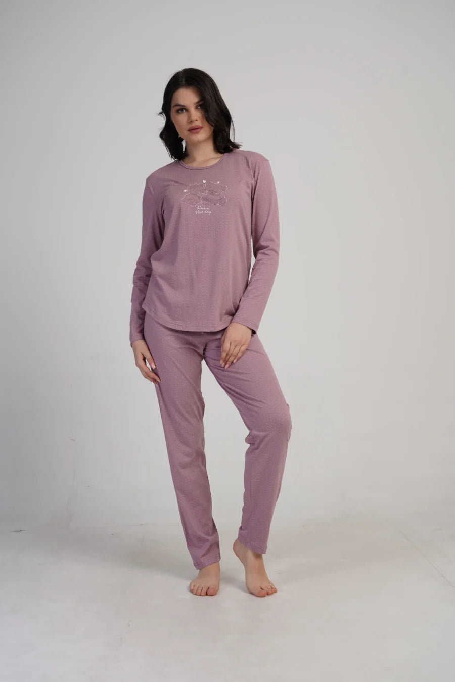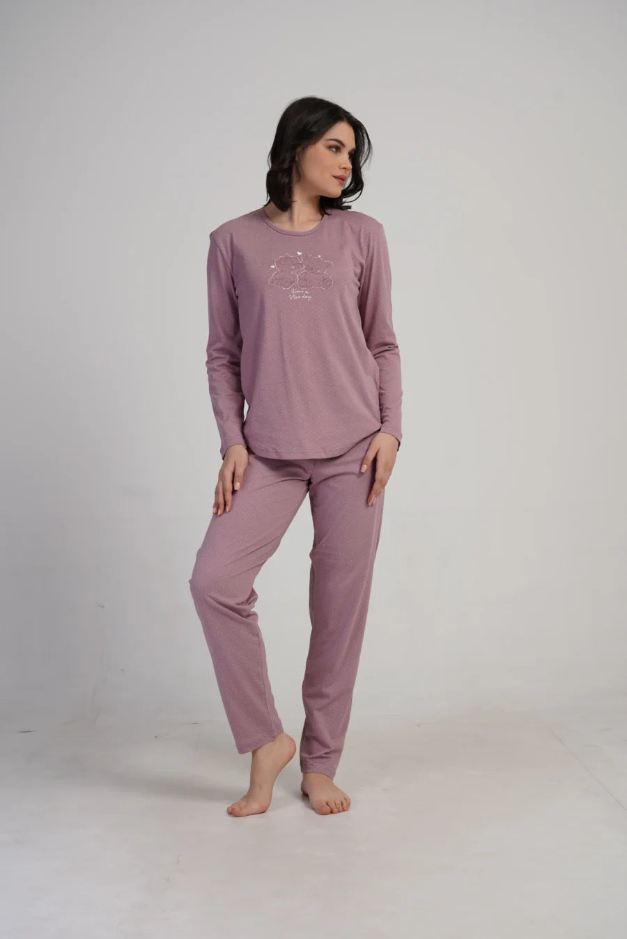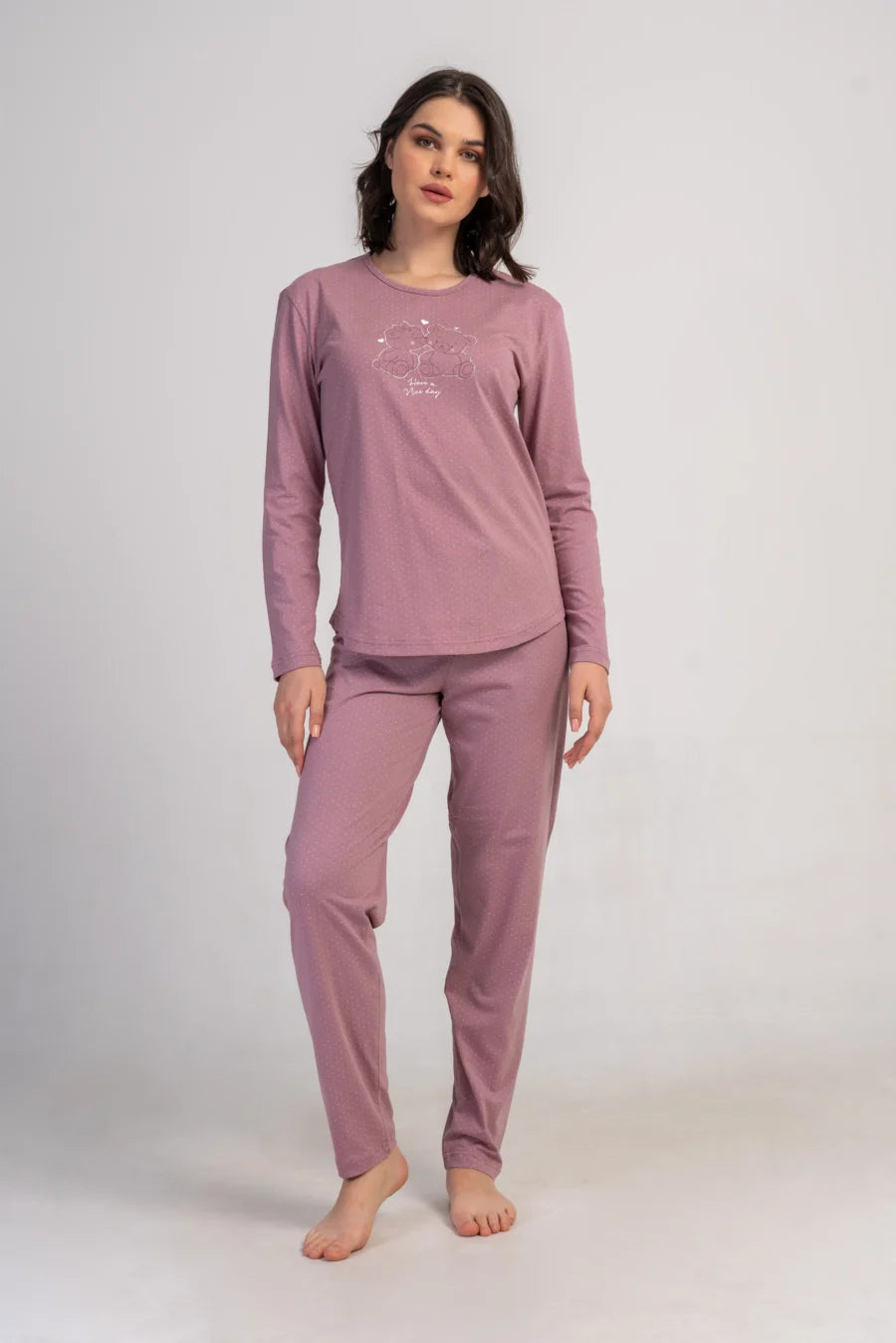 Całość utrzymana jest w delikatnym, śliwkowym odcieniu brudnego różu, ozdobionym drobnymi, białymi kropeczkami. Na froncie bluzki znajduje się uroczy nadruk dwóch misiów z napisem „Have a Nice Day”, który dodaje piżamie ciepłego i przyjaznego charakteru.