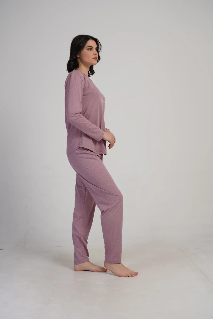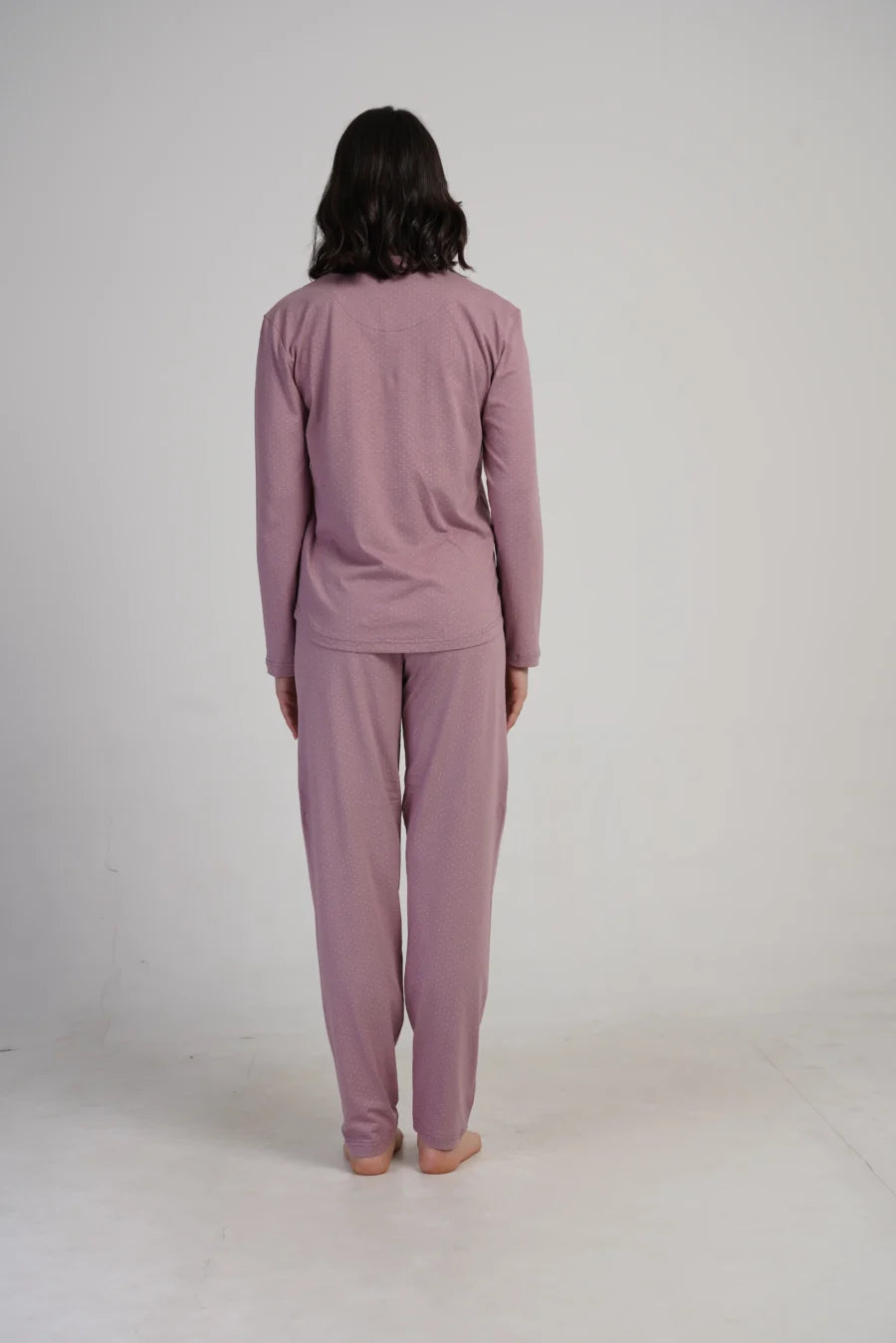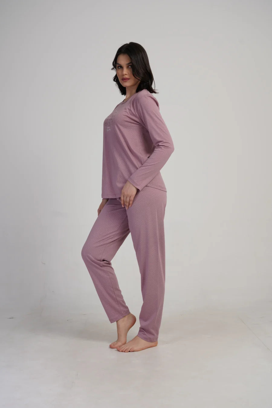 Stylowa i wygodna piżama damska w klasycznym wydaniu, idealna na chłodniejsze wieczory i poranki. Dwuczęściowy komplet składa się z bluzki z długim rękawem oraz prostych spodni, które zapewniają maksymalny komfort noszenia.