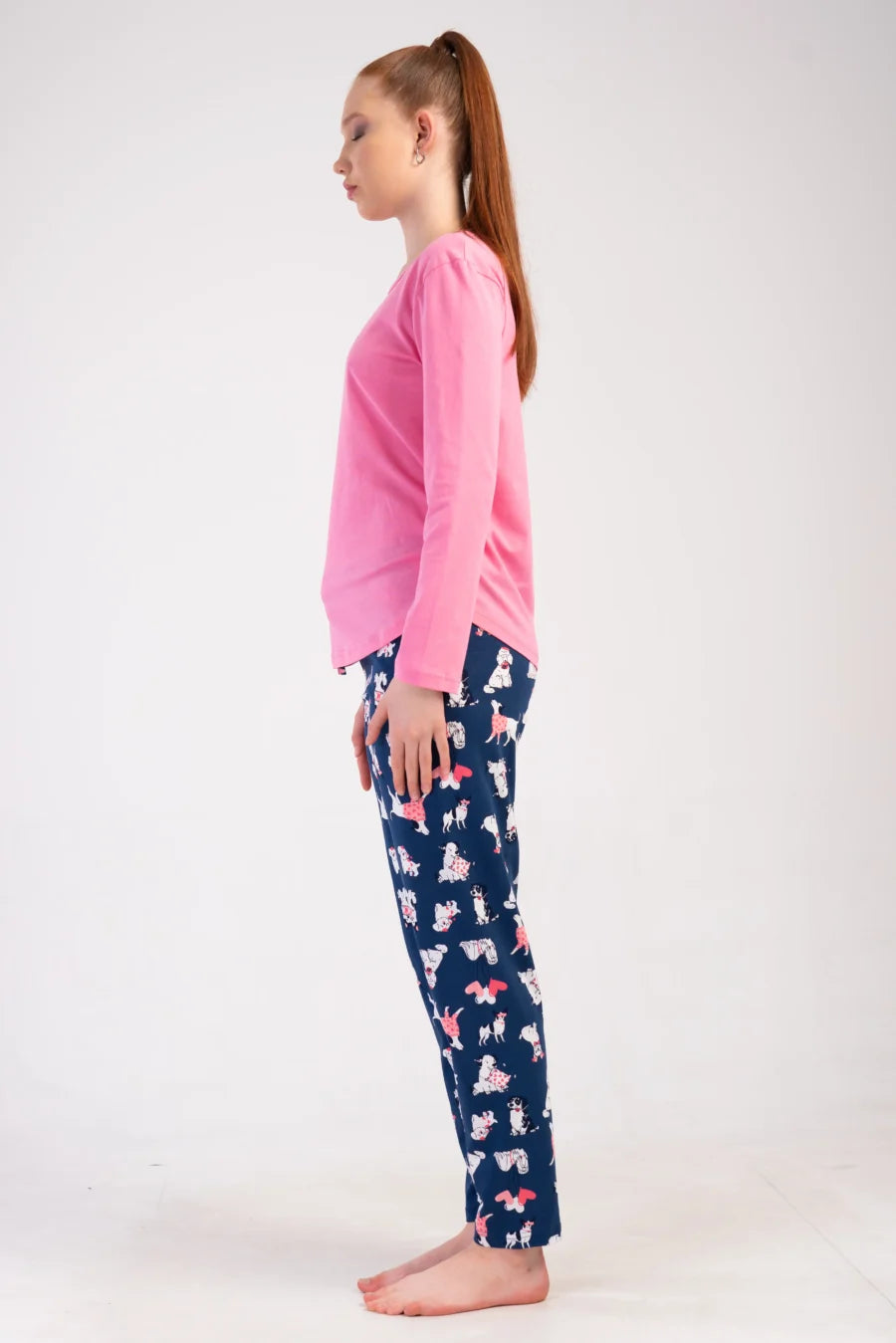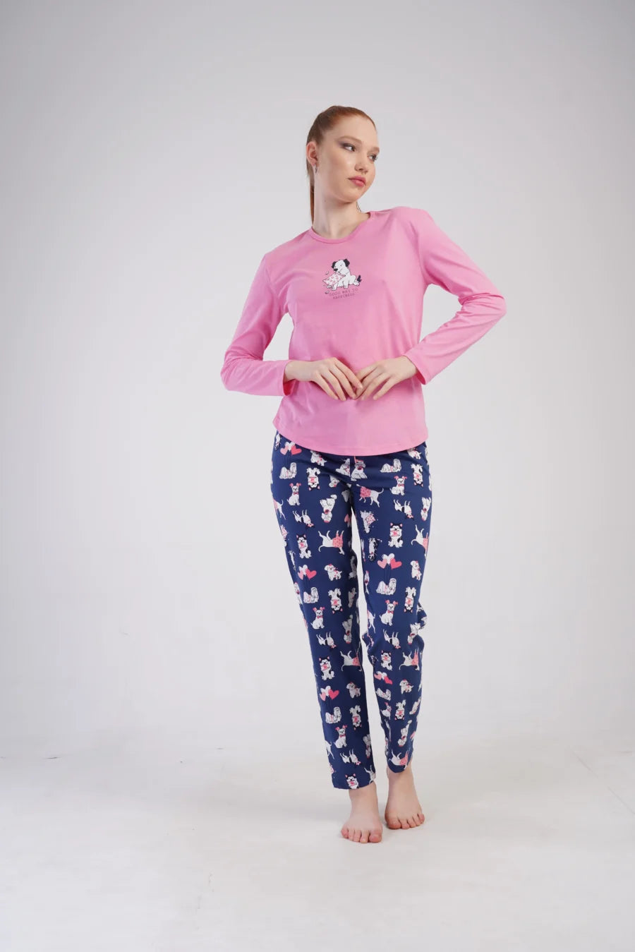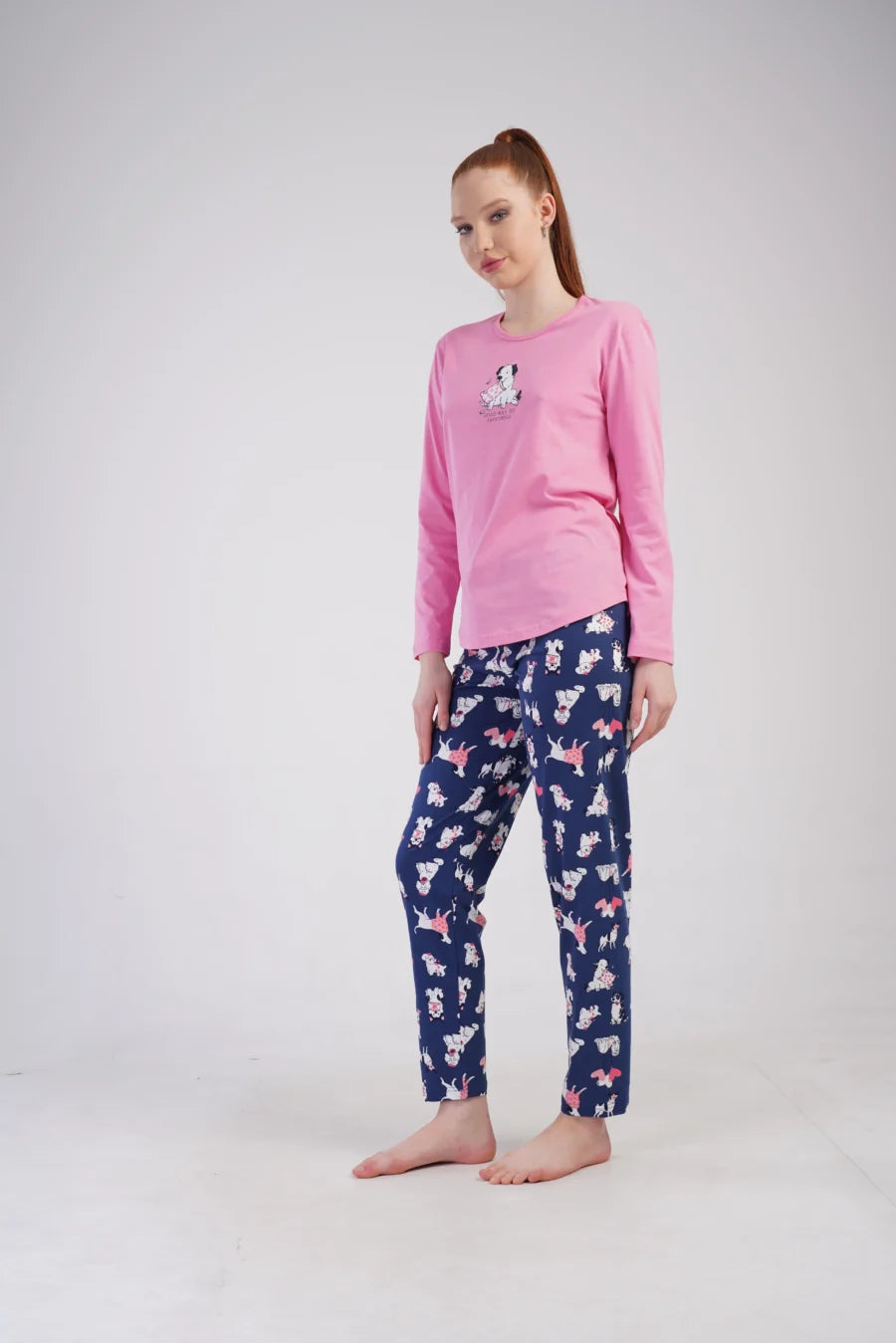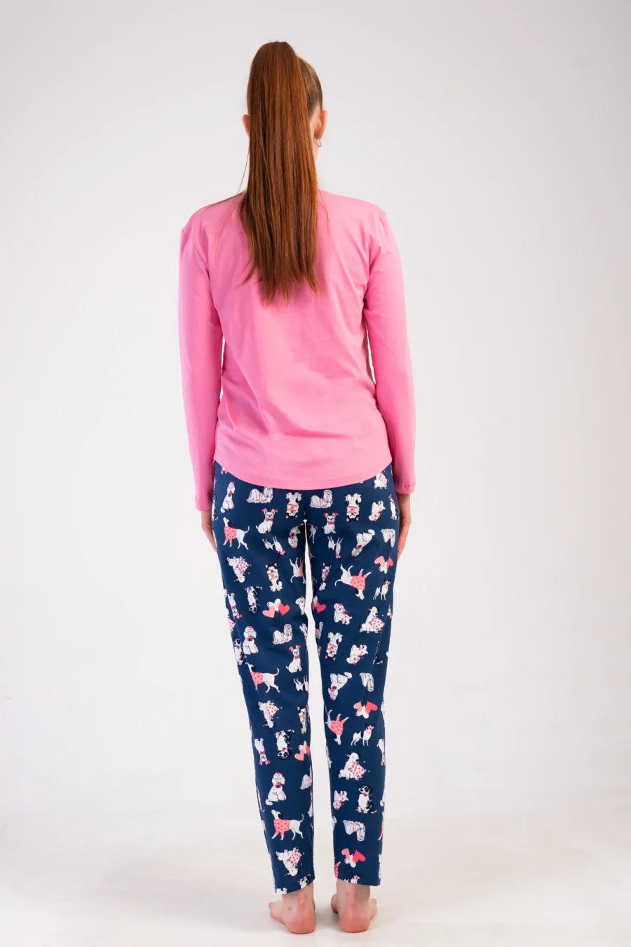 Wprowadź odrobinę radości do swoich wieczornych rytuałów dzięki tej uroczej piżamie damskiej z motywem zwierząt! Dwuczęściowy komplet to idealne połączenie komfortu i stylu – różowa bluzka z nadrukiem białego pieska i granatowe spodnie z wesołymi postaciami zwierząt sprawiają, że sen staje się jeszcze przyjemniejszy.