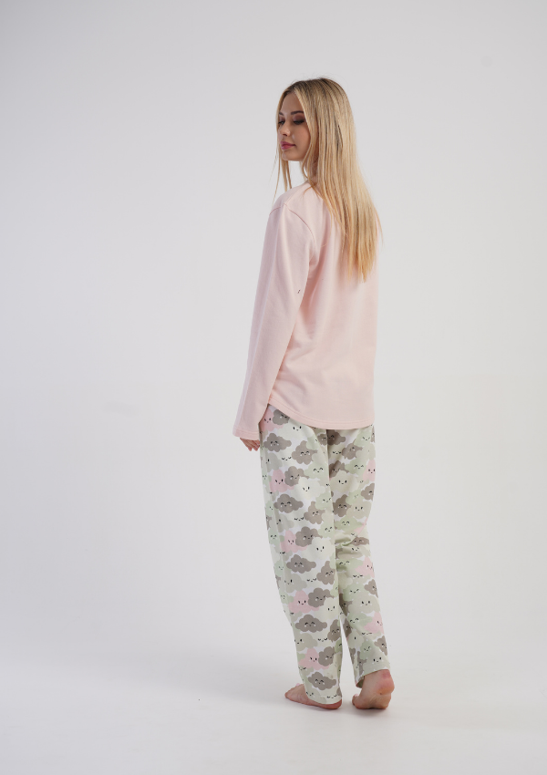 Bluzka w delikatnym, różowym odcieniu ozdobiona jest nadrukiem słodkich chmurek, a spodnie w jasnej tonacji zdobi pastelowy wzór różowo-szarych chmurek, tworząc przyjemny, harmonijny komplet. Całość utrzymana w miękkiej kolorystyce sprawia, że piżama doskonale sprawdzi się podczas wieczornego relaksu i spokojnego snu.