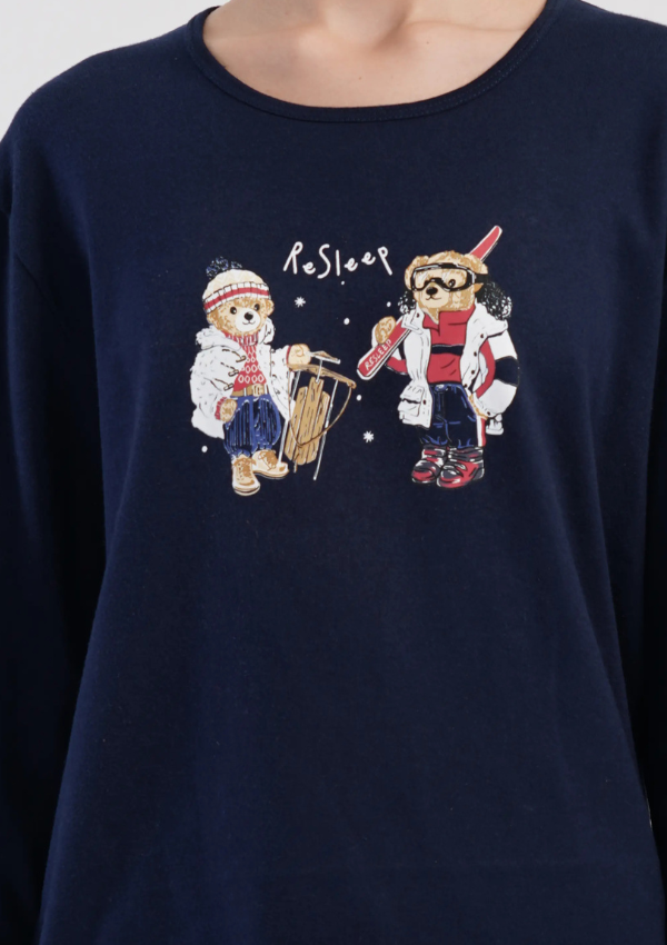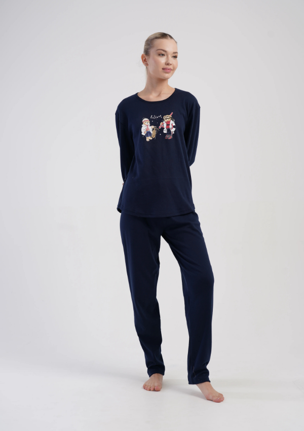 Ta piżama to doskonały wybór dla kobiet, które cenią połączenie klasyki, wygody i przyjemnego ciepła. Model wykonano z miękkiej, elastycznej bawełny interlock, która delikatnie otula ciało, a jednocześnie zapewnia przewiewność i komfort przez całą noc. Góra w głębokim odcieniu granatu zdobiona jest uroczym nadrukiem postaci, wprowadzając subtelny, dziewczęcy akcent.