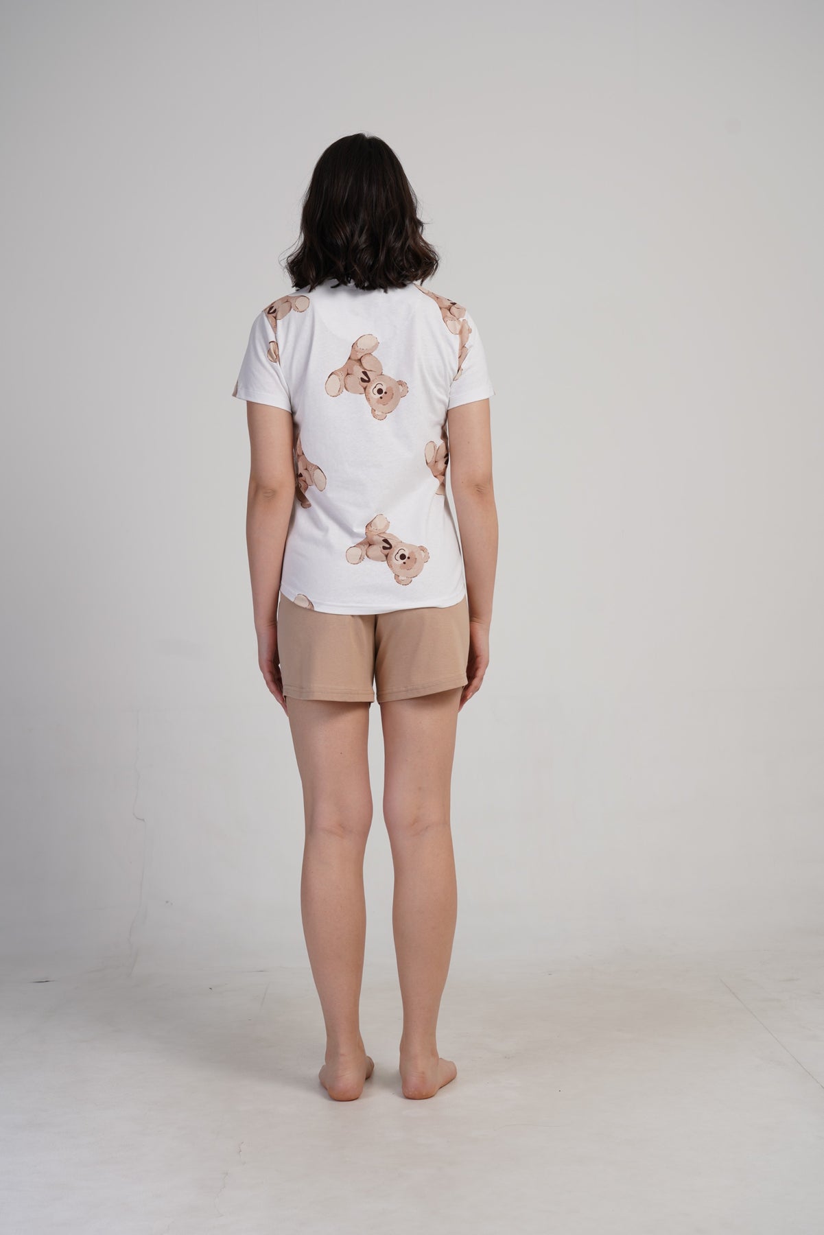 Lekka i komfortowa piżama damska bawełniana to idealny wybór na lato i cieplejsze noce. Zestaw składa się z białej koszulki z krótkim rękawem, ozdobionej uroczym nadrukiem misiów, oraz krótkich beżowych spodenek z elastyczną talią i troczkiem do regulacji, które zapewniają doskonałe dopasowanie.