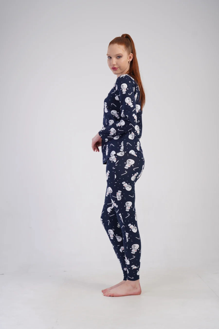 Całość utrzymana jest w granatowej tonacji i ozdobiona uroczym nadrukiem – bałwanki, laski cukrowe i gwiazdki tworzą niepowtarzalny, radosny klimat świąt. Dzięki temu piżama nie tylko zapewnia wygodę, ale również cieszy oko i wprawia w dobry nastrój.