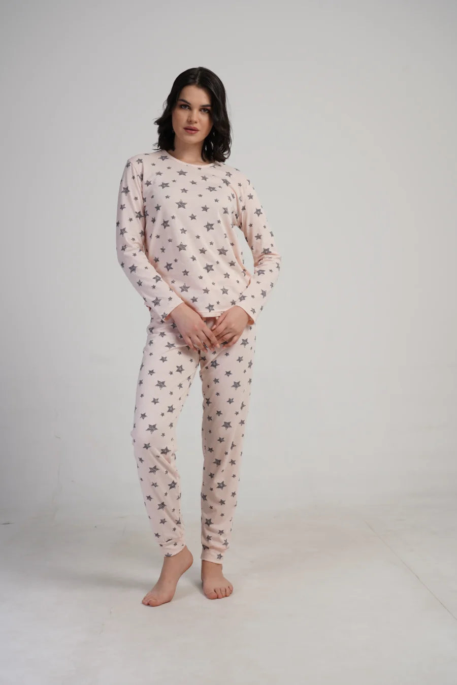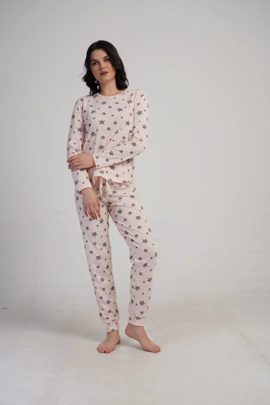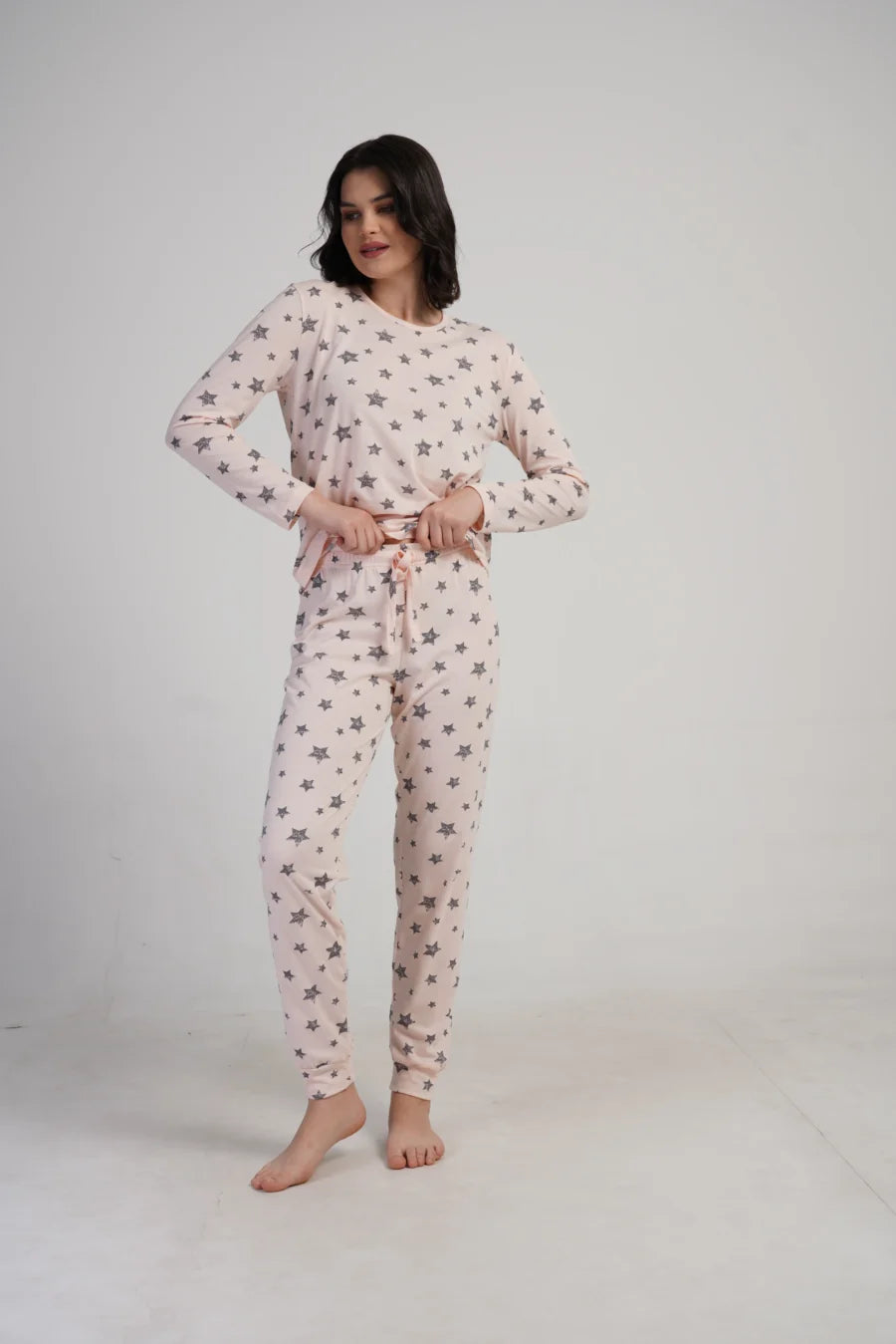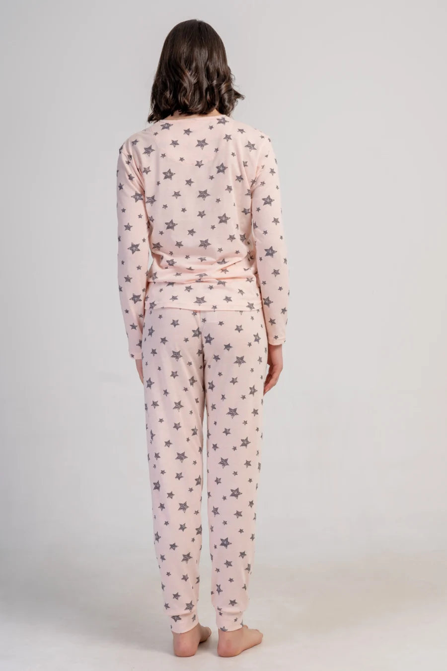 Zarówno bluzka, jak i spodnie utrzymane są w jednolitym, pudroworóżowym kolorze, ozdobione subtelnym nadrukiem szarych gwiazdek, który nadaje piżamie lekkości i uroku. Luźny fason sprawia, że komplet doskonale dopasowuje się do sylwetki, zapewniając swobodę ruchów przez całą noc.