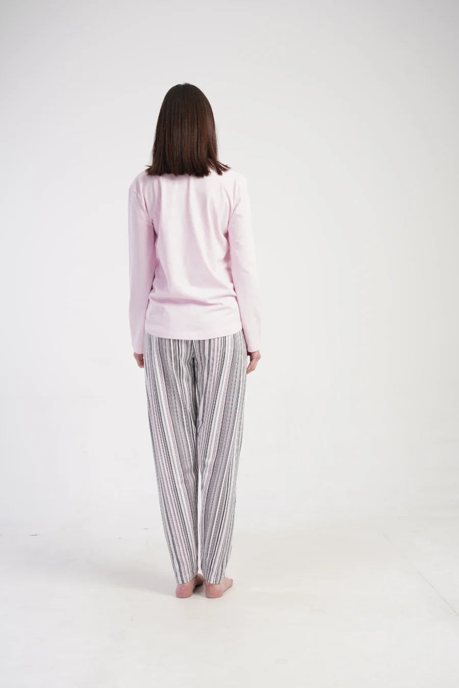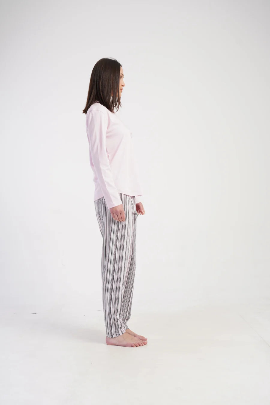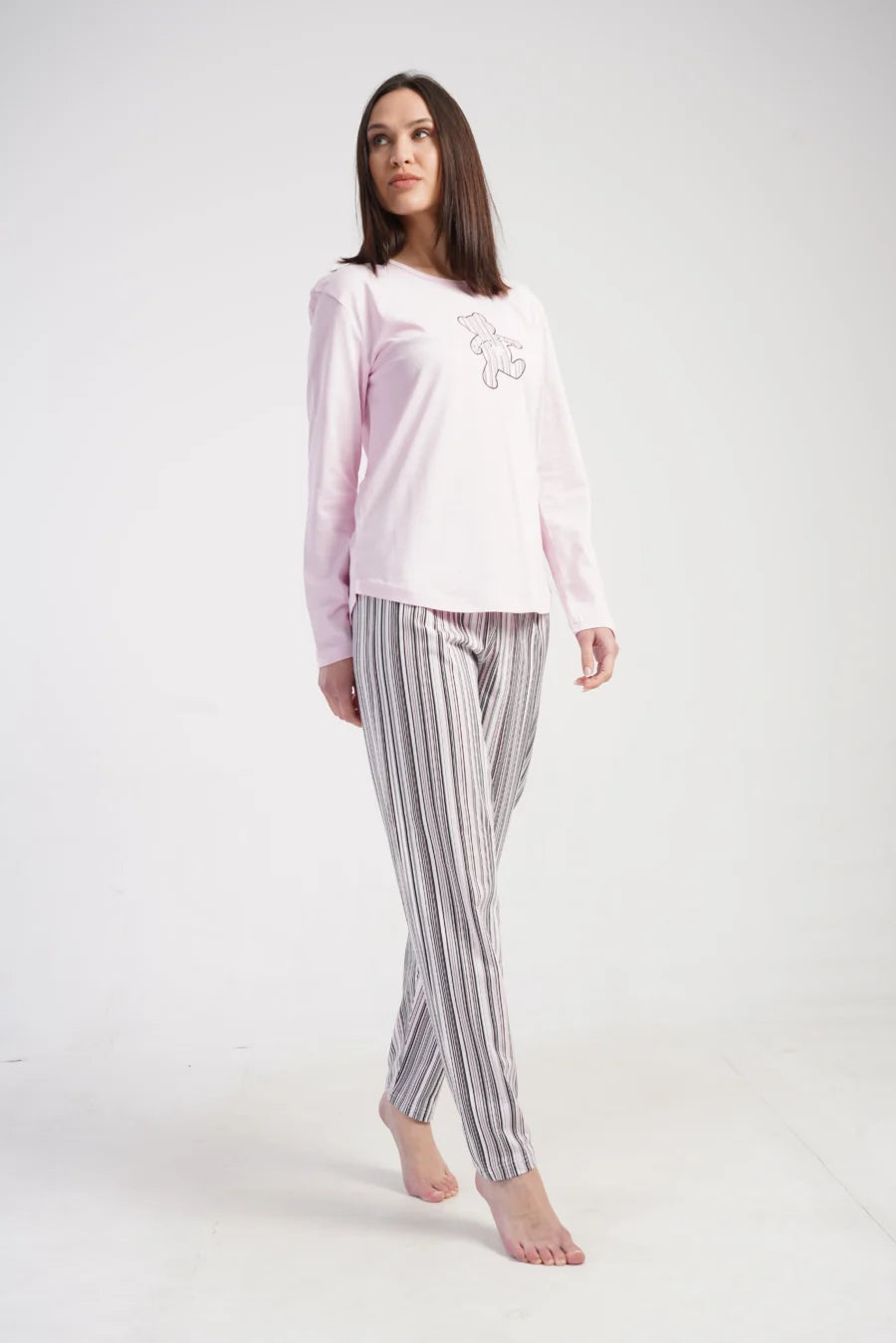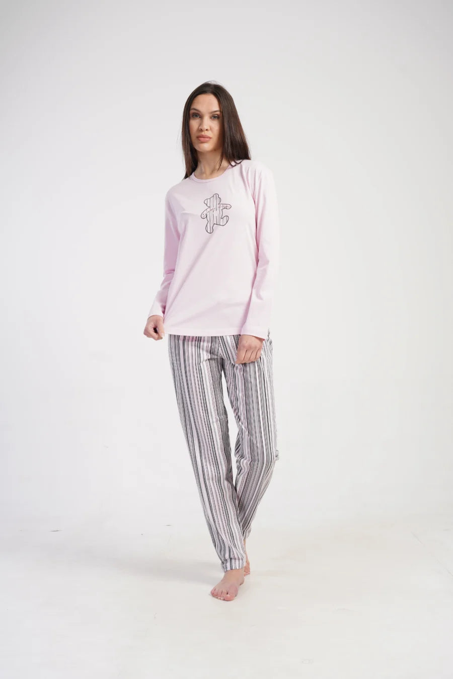 Spodnie z długą nogawką utrzymane są w delikatnych pastelowych kolorach – różu, bieli i szarości – w klasyczny, pionowy pas. Elastyczna gumka w pasie sprawia, że świetnie dopasowują się do sylwetki, zapewniając komfort przez całą noc. Całość została wykonana z wysokiej jakości 100% bawełny – naturalnej i oddychającej tkaniny idealnej do spania.