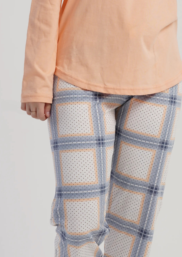 KOLOR: Brzoskwiniowa bluzka z jasnymi spodniami w kratę