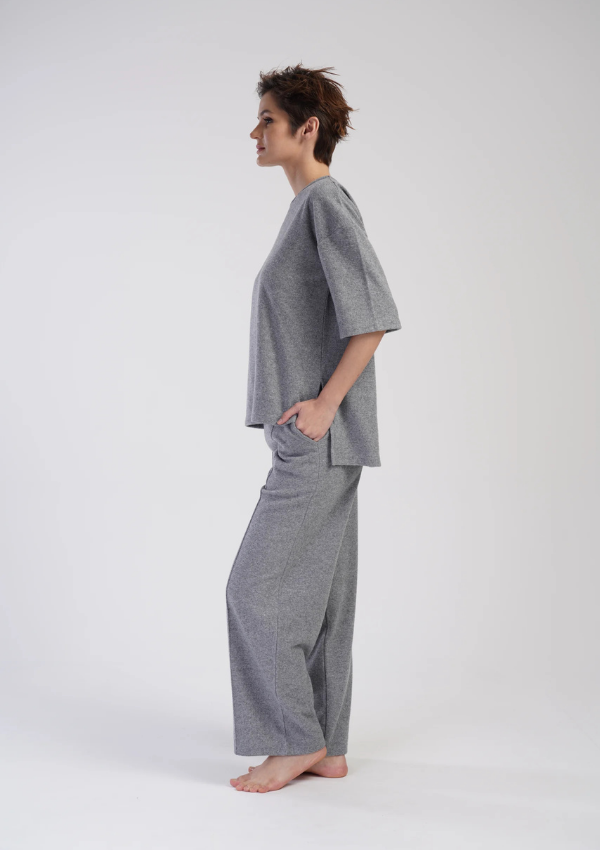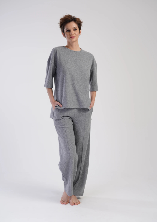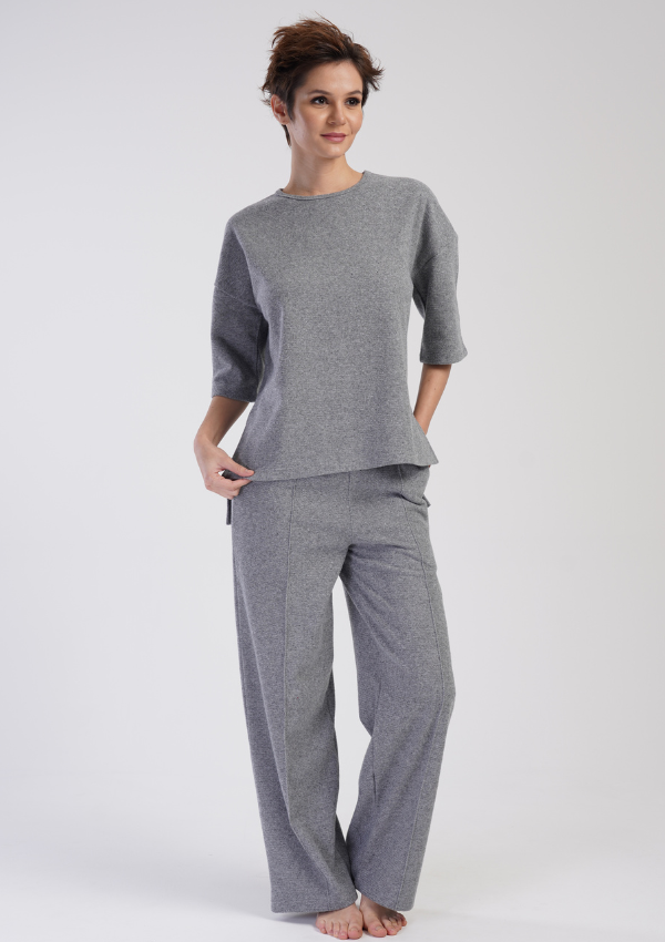 Piżama ma klasyczny krój – bluzka z długim rękawem i spodnie z elastyczną gumką w pasie, zapewniające pełną swobodę ruchów i wygodę podczas snu. Utrzymana w eleganckim grafitowym kolorze, prezentuje się ponadczasowo i subtelnie.