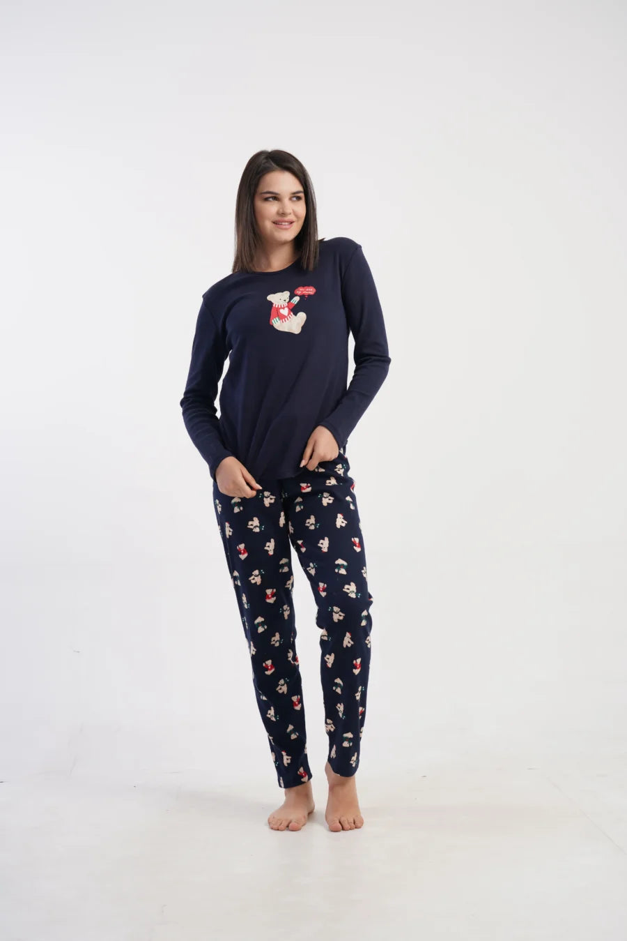 Bluzka w głębokim odcieniu granatu ozdobiona jest uroczym nadrukiem misia w zimowej stylizacji, który natychmiast wprowadzi Cię w ciepły, świąteczny nastrój. Spodnie w tym samym kolorze, pokryte subtelnym wzorem z motywem misiów, tworzą spójny i przyjemny dla oka komplet.