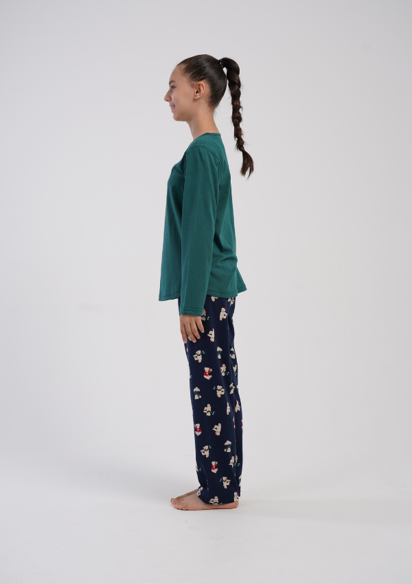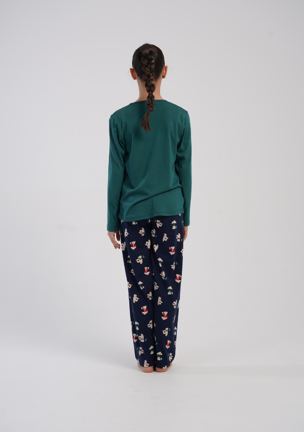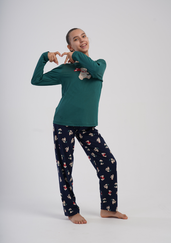 Bluzka z długim rękawem dostępna jest w pięknym zielonym kolorze, ozdobiona nadrukiem uroczego misia. Świątecznego charakteru dopełniają granatowe spodnie z powtarzającym się motywem misiów w czapkach Mikołaja. Całość tworzy przytulny, radosny komplet idealny na sen i domowy wypoczynek.