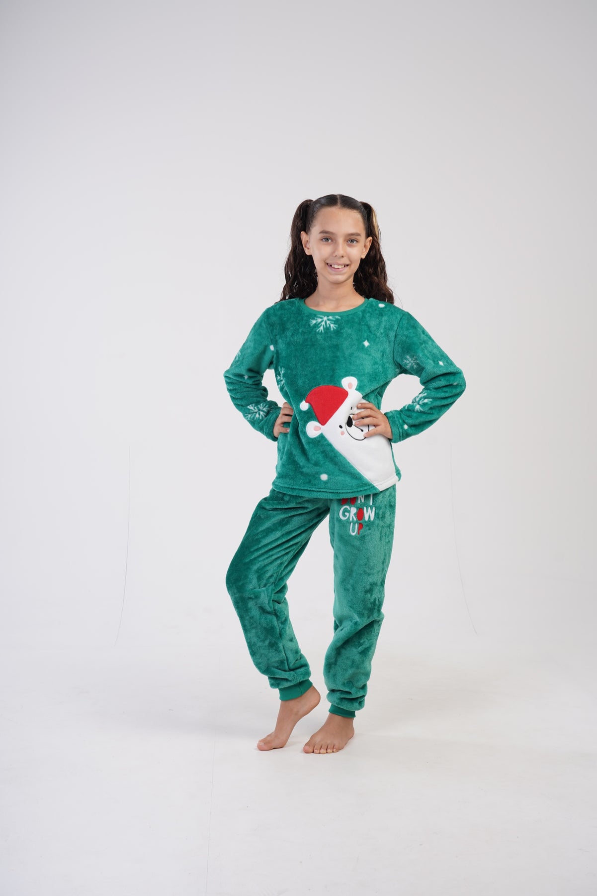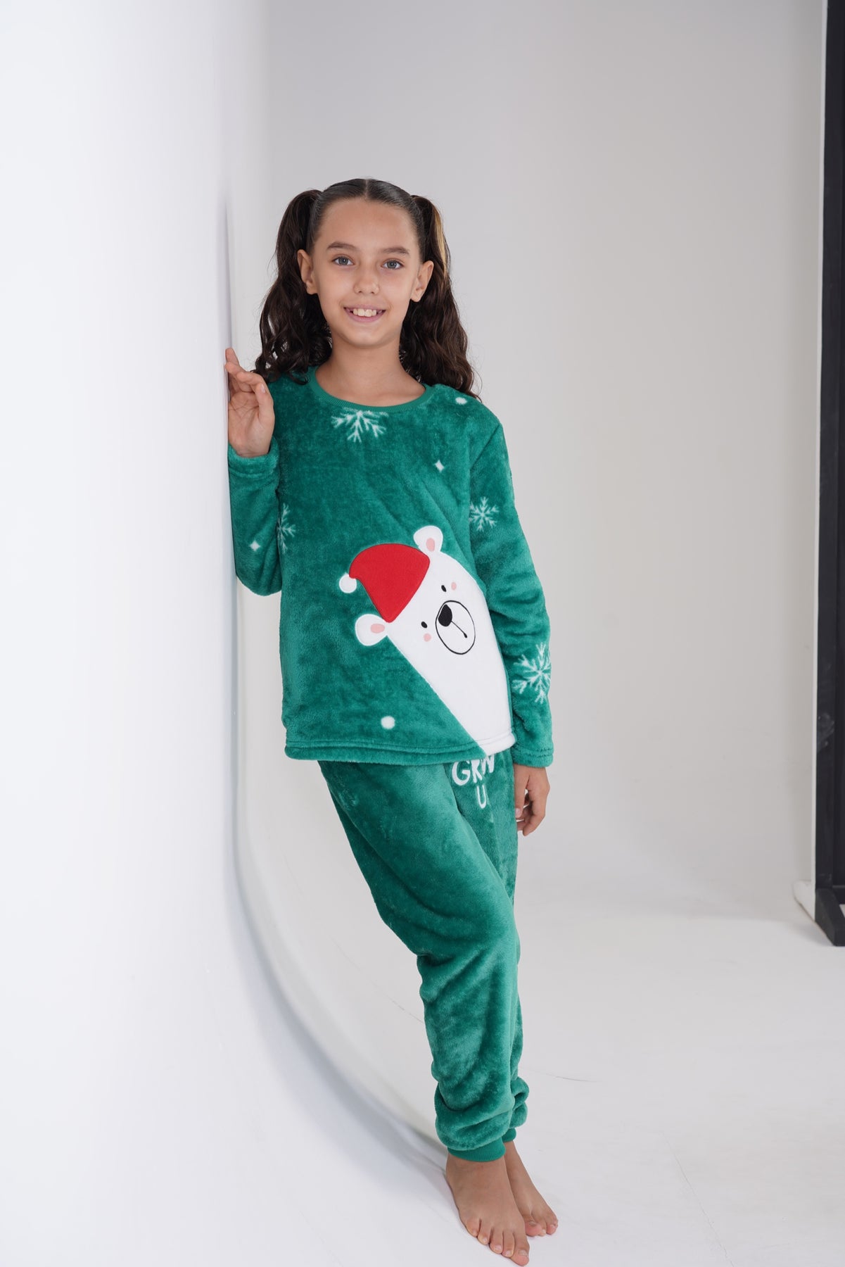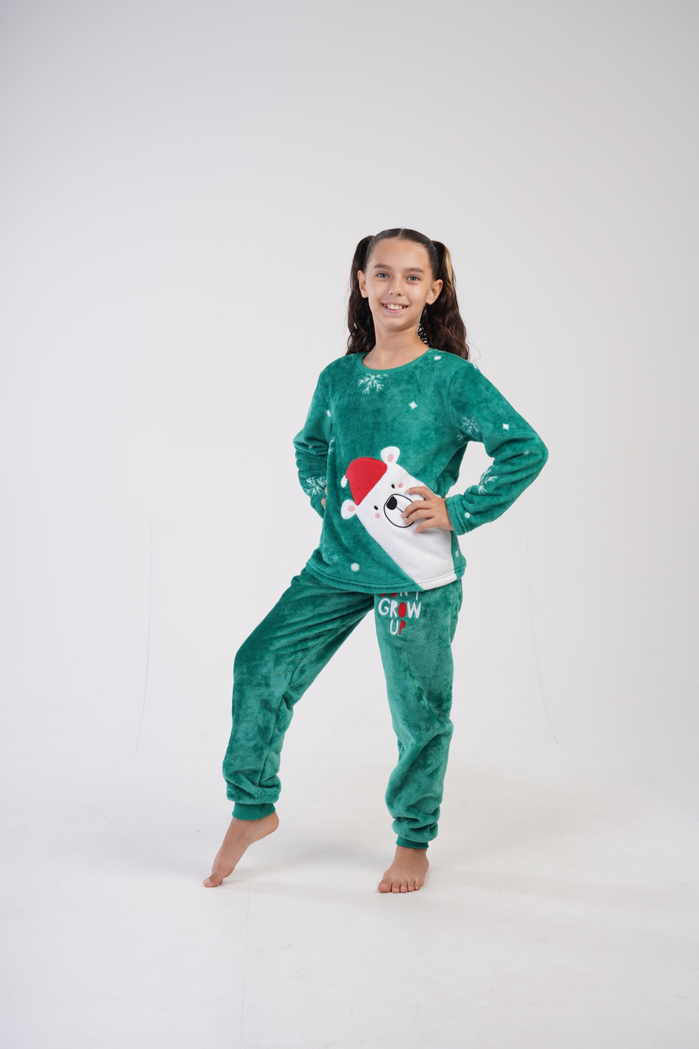 Zestaw składa się z bluzy z długim rękawem oraz długich spodni. Góra w intensywnym zielonym kolorze została ozdobiona dużą grafiką misia w czapce Mikołaja oraz śnieżnymi motywami, co od razu wprowadza świąteczny vibe.