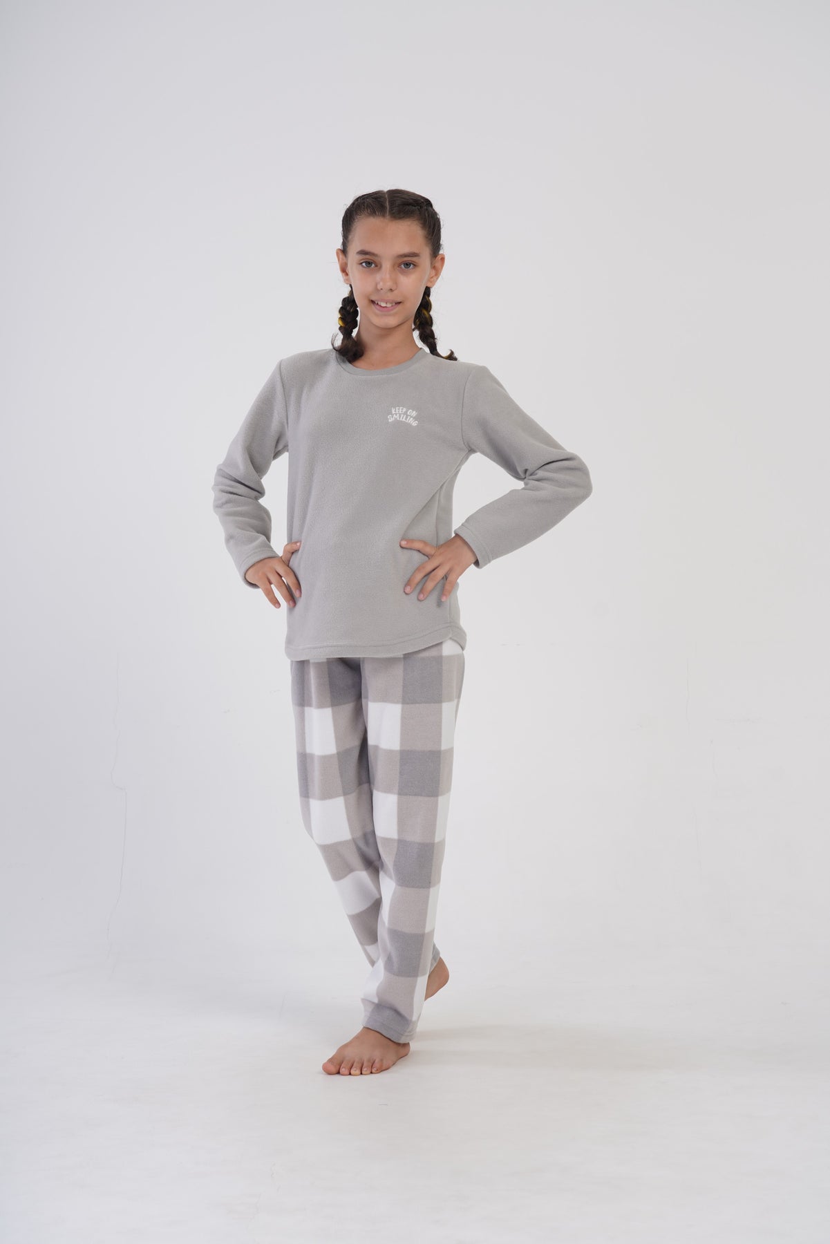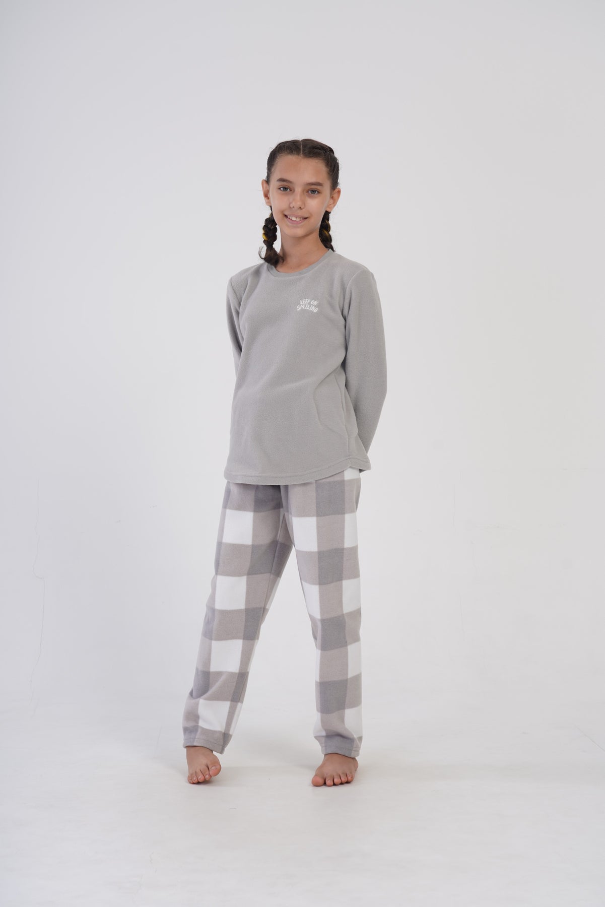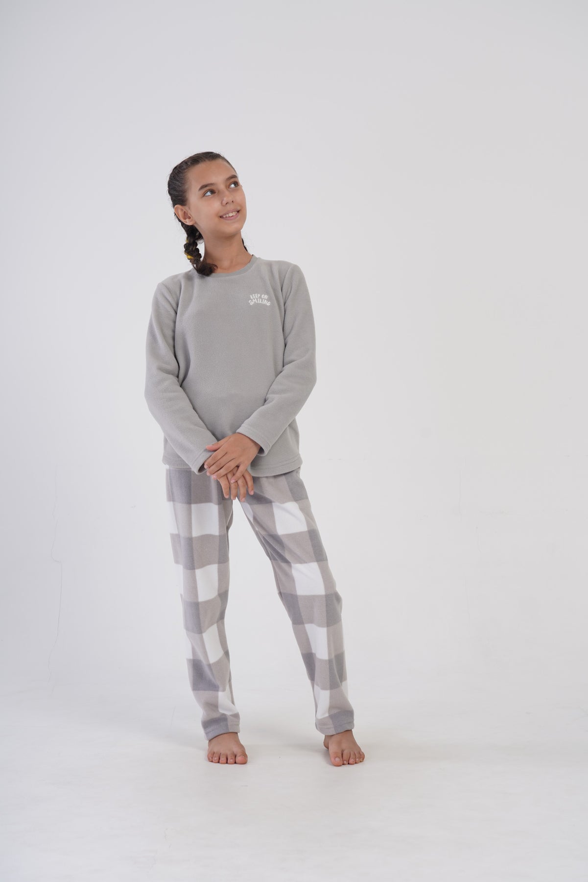 Bluzka w jednolitym szarym kolorze ozdobiona została subtelnym nadrukiem „Keep Sailing” przy dekolcie, co dodaje jej nowoczesnego charakteru. Do kompletu dołączone są spodnie w biało-szaro-beżową kratę, o luźnym, komfortowym kroju z elastyczną talią, gwarantującą swobodę ruchów i wygodę podczas snu.