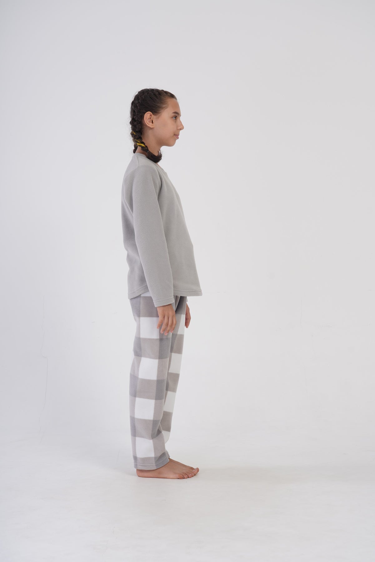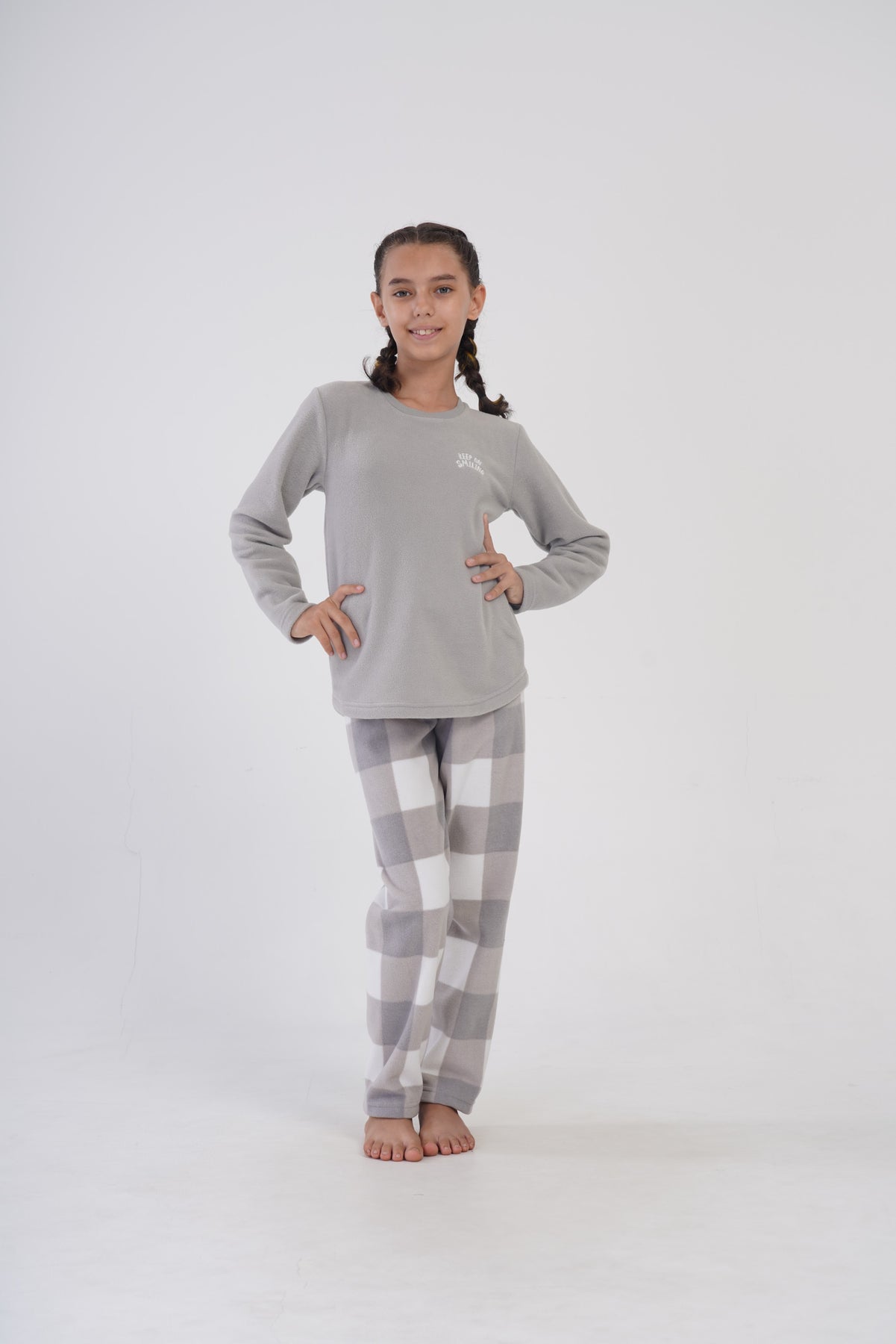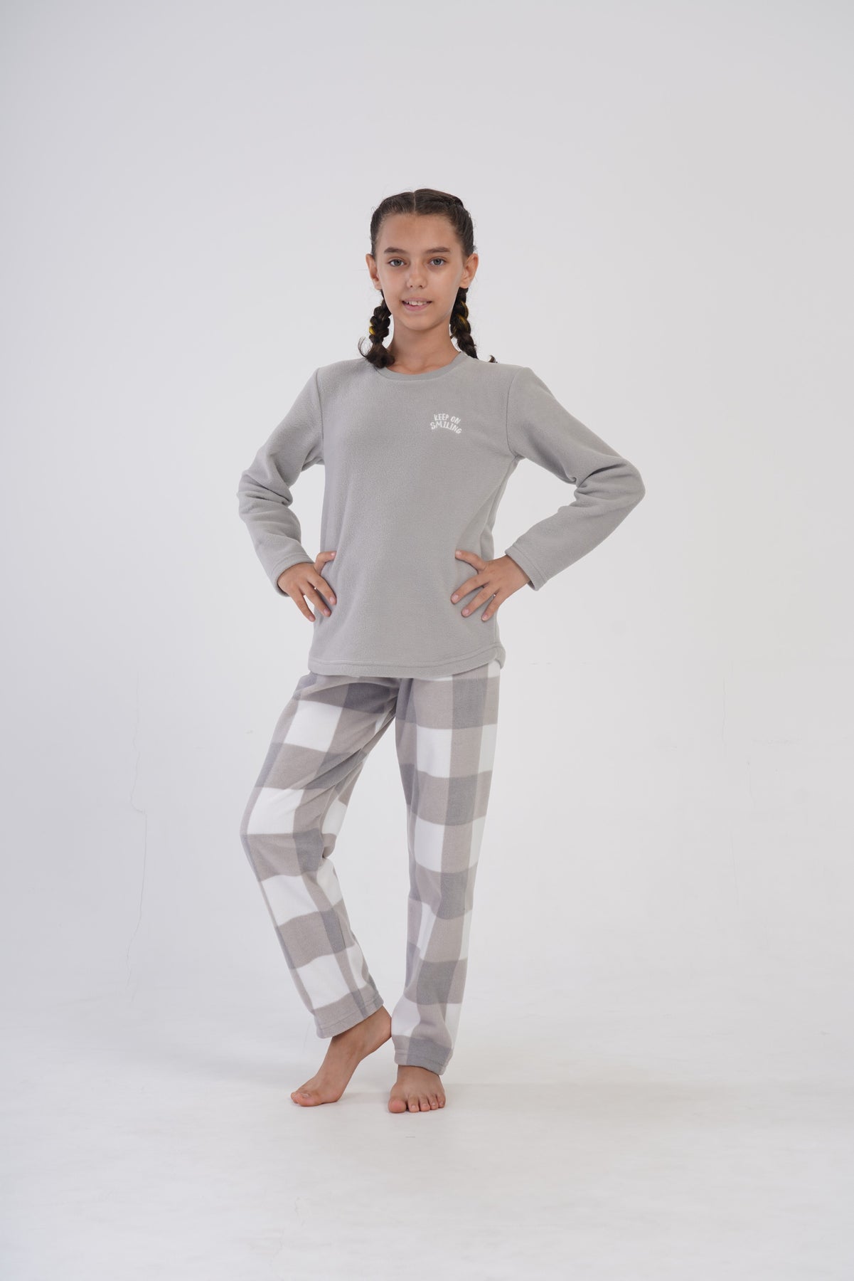 Bluzka w jednolitym szarym kolorze ozdobiona została subtelnym nadrukiem „Keep Sailing” przy dekolcie, co dodaje jej nowoczesnego charakteru. Do kompletu dołączone są spodnie w biało-szaro-beżową kratę, o luźnym, komfortowym kroju z elastyczną talią, gwarantującą swobodę ruchów i wygodę podczas snu.