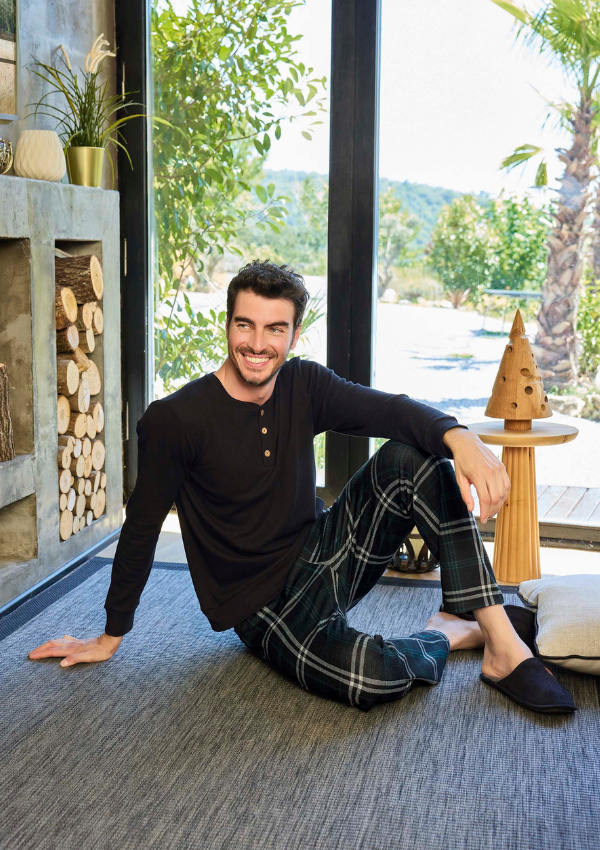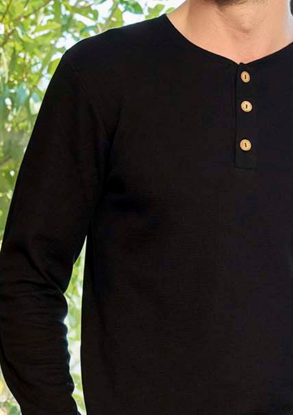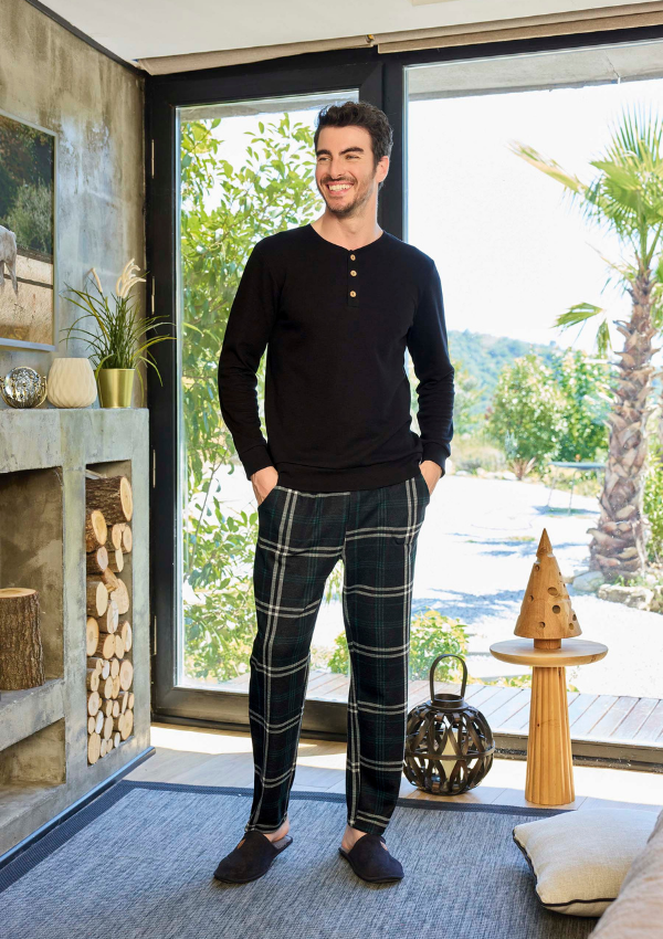 Stylowa i wygodna piżama męska z długim rękawem stworzona z myślą o codziennym komforcie. Góra w czarnym kolorze z dekoltem typu henley zapinanym na guziki łączy klasyczny fason z nowoczesnym wyglądem.
