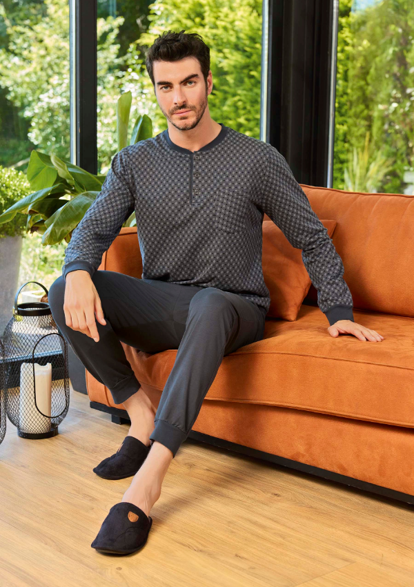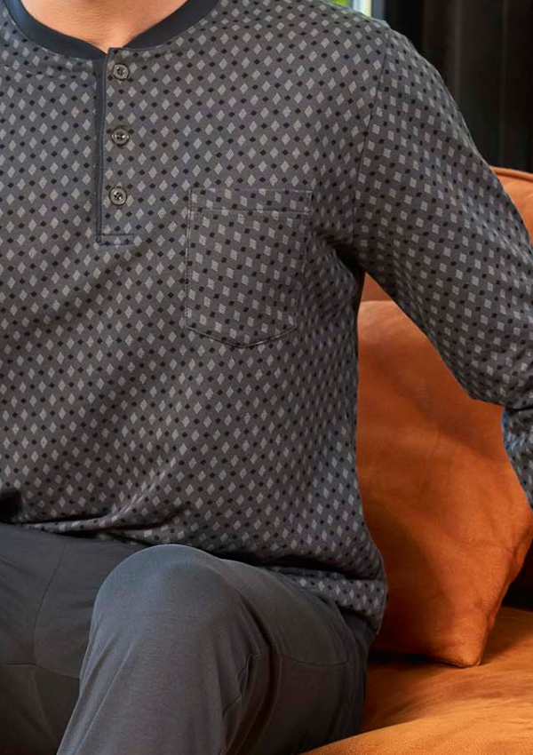 Klasyczna męska piżama z długim rękawem to propozycja dla panów, którzy cenią sobie komfort i prosty, ale stylowy design. Góra w drobny, geometryczny wzór została wyposażona w dekolt typu henley zapinany na guziki oraz praktyczną kieszonkę na piersi. Kontrastowa lamówka przy dekolcie oraz ściągacze przy mankietach podkreślają nowoczesny charakter modelu.