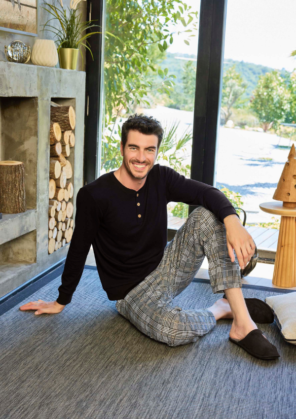Do kompletu dołączono spodnie w odcieniach szarości z modnym, geometrycznym wzorem w kratę. Dzięki elastycznej talii zapewniają wygodę i swobodę ruchów podczas snu i odpoczynku.