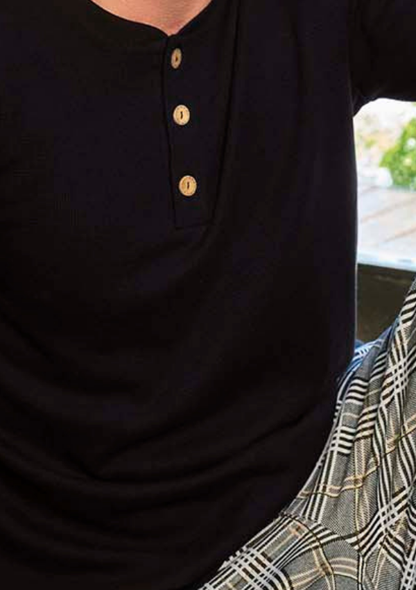Bluzka w kolorze czarnym, wykonana z tkaniny o wyjątkowej strukturze waffle, prezentuje się niezwykle stylowo. Dekolt typu henley zapinany na guziki dodaje jej nowoczesnego charakteru i sprawia, że idealnie sprawdzi się także jako homewear.