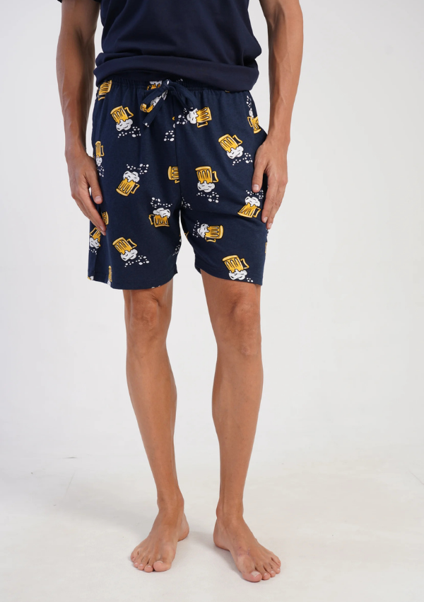 Krótkie spodenki pokryte humorystycznym piwnym wzorem – kufle z pianką i bąbelkami – idealnie dopełniają zestaw. Elastyczna gumka w pasie zapewnia dobre dopasowanie i komfort noszenia bez ucisku.