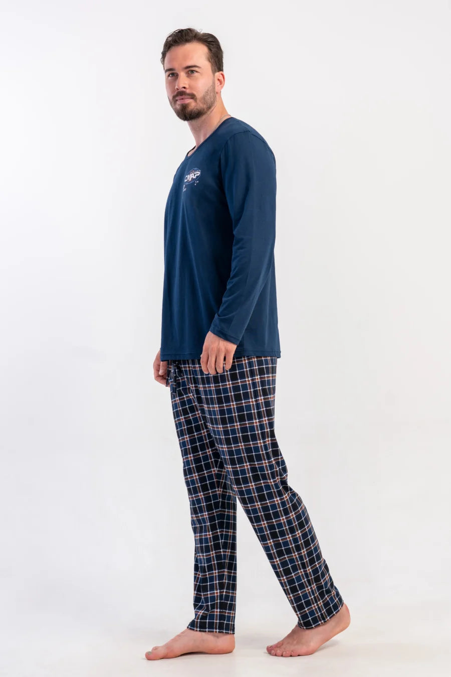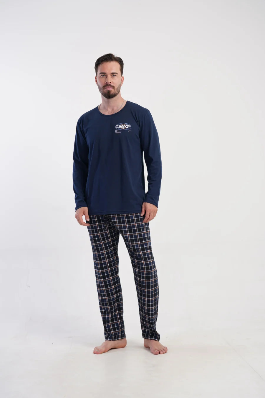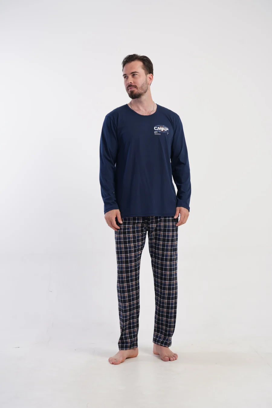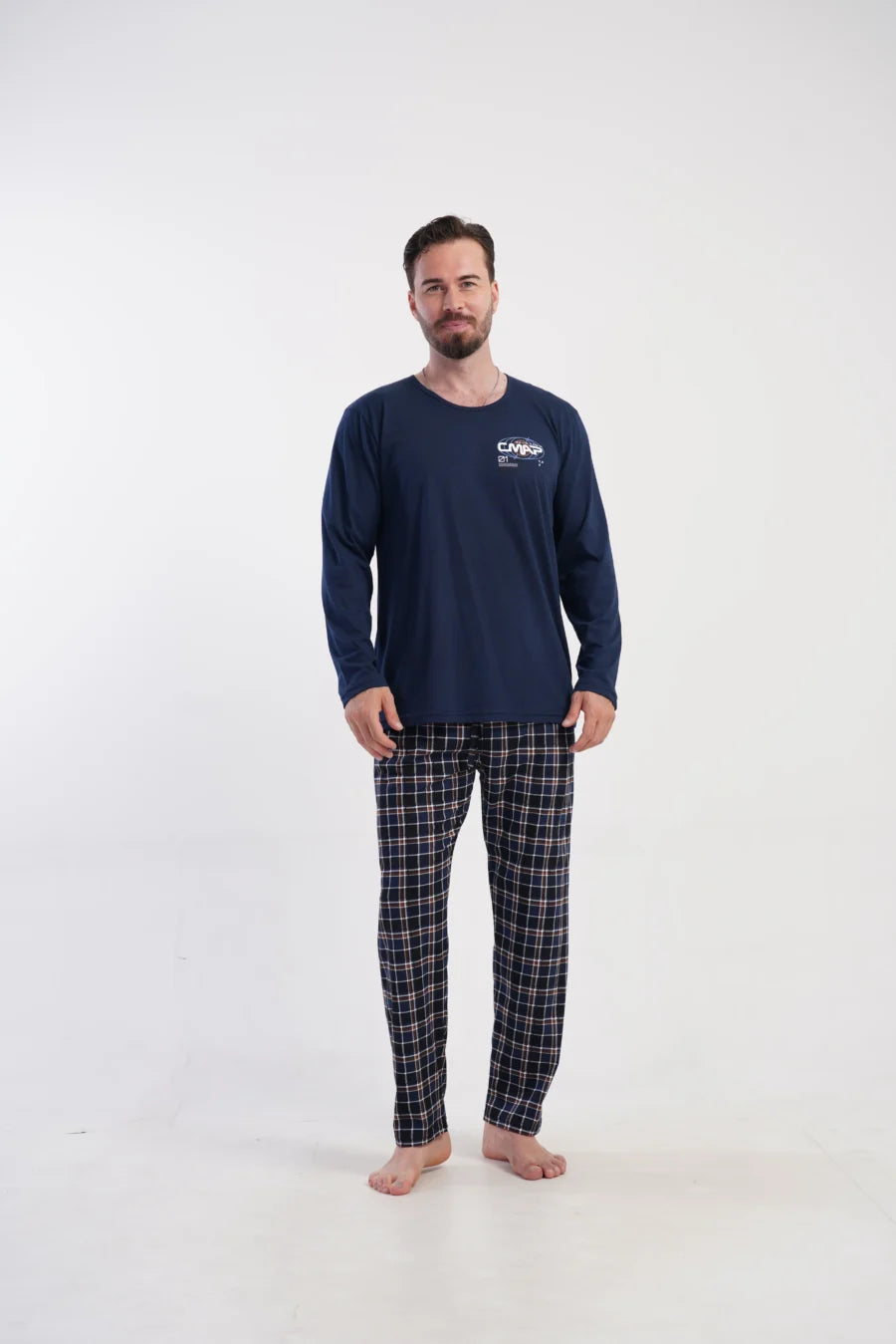 Stylowa piżama męska, która łączy klasykę z wygodą. Góra w kolorze granatowym ozdobiona nadrukiem „CAMP EXPEDITION” nadaje całości nowoczesnego charakteru, natomiast spodnie w klasyczną kratę w odcieniach granatu, czerwieni i bieli podkreślają ponadczasowy styl.